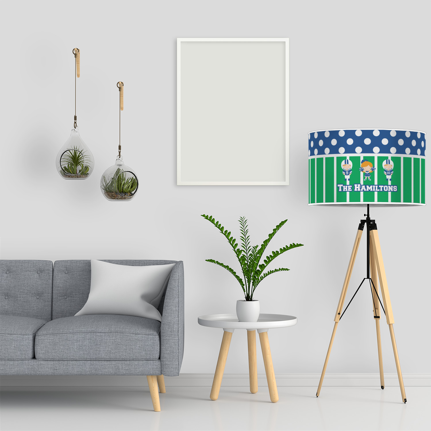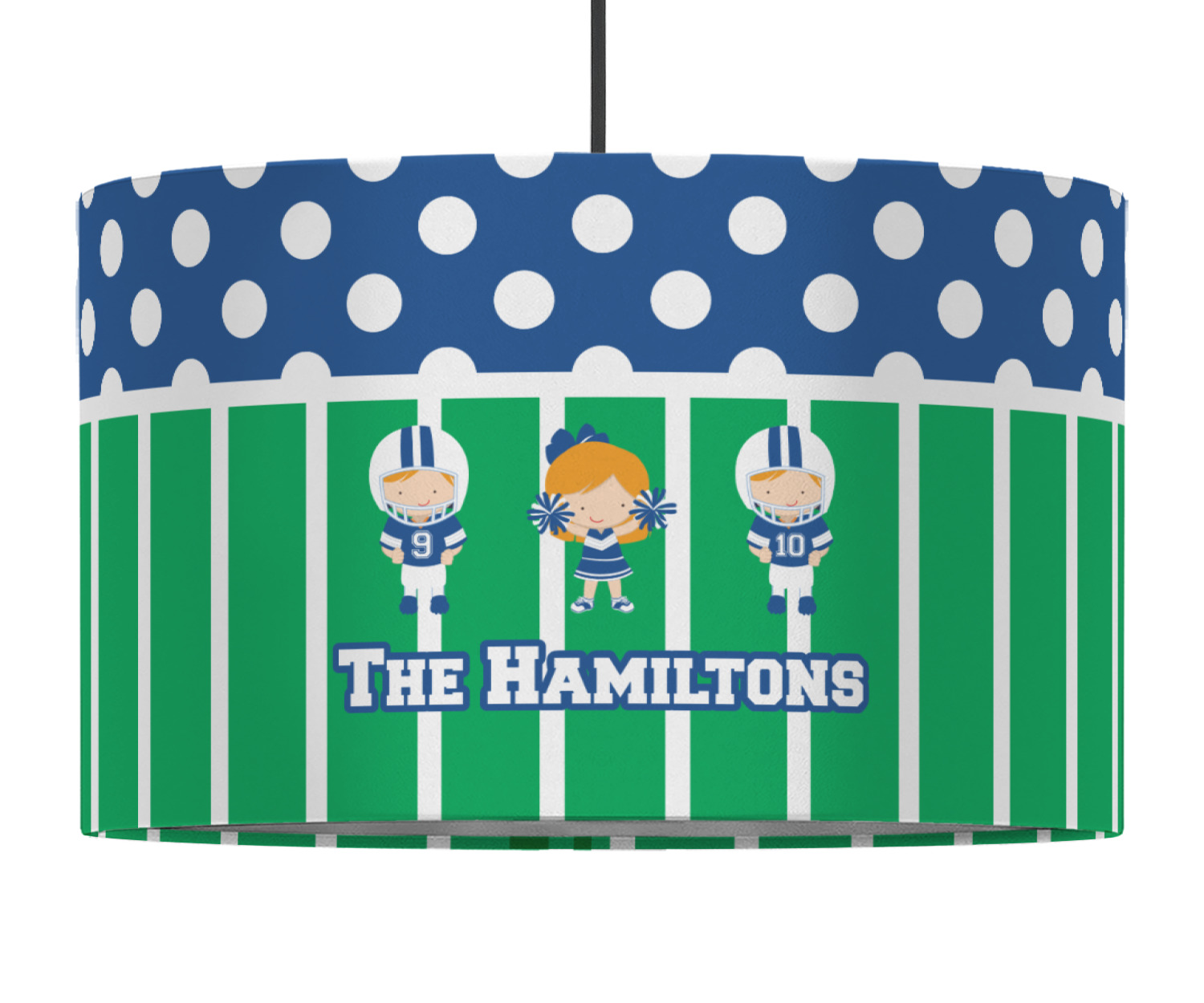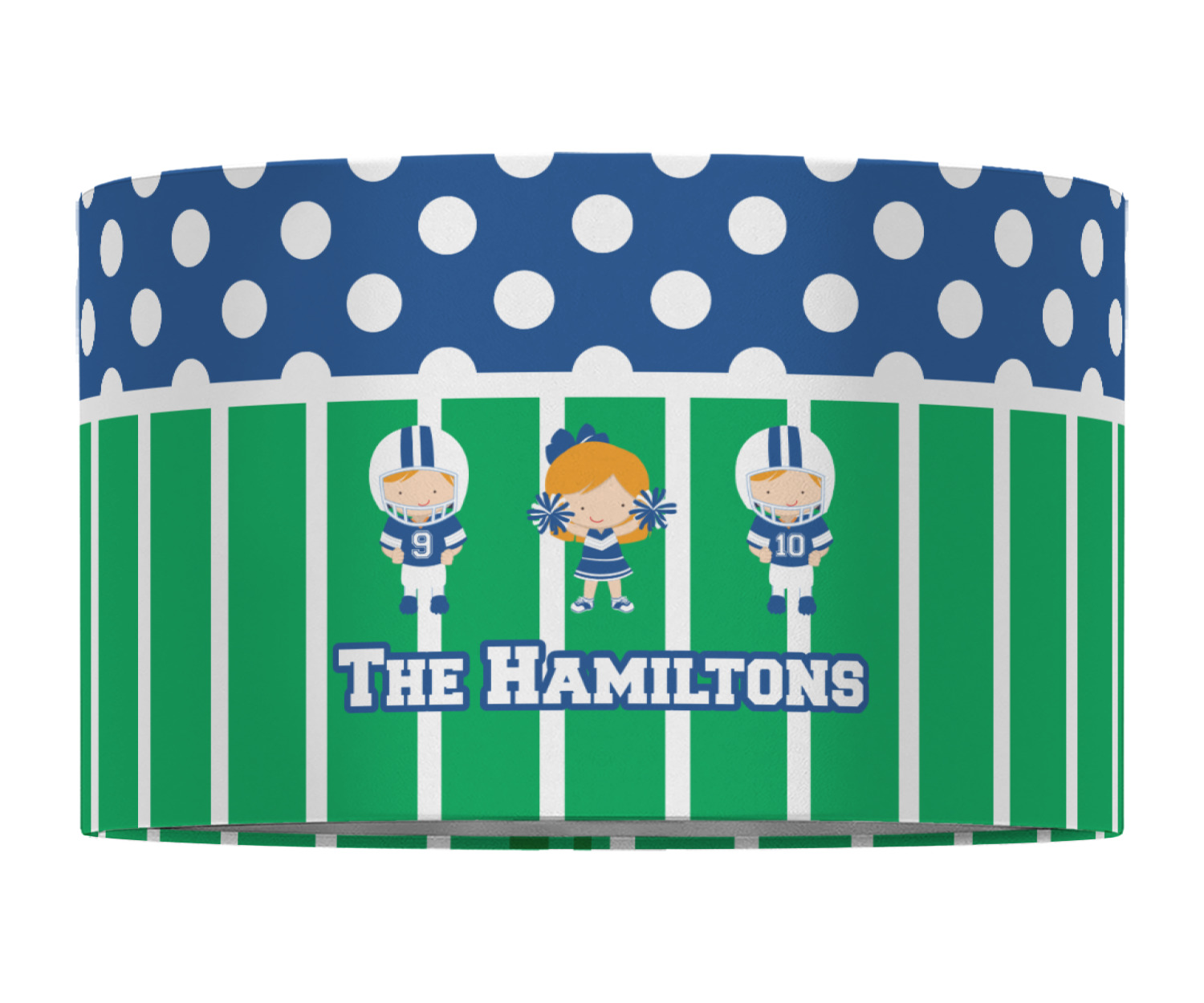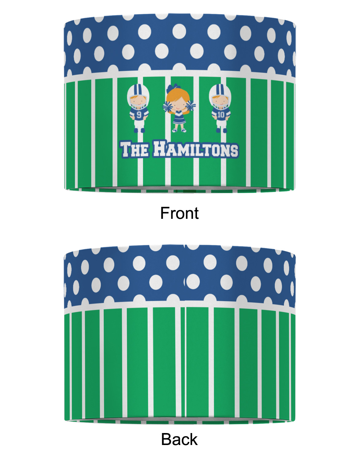 What a great way to showcase your kids and the love of football. A fun polka dot pattern on the top brings fun to the design, while the bottom is the football field. This design is so versatile. Whether you have a football player and a cheerleader, or two football players, or even two cheerleaders and one football player you can mix and match up to three kids.