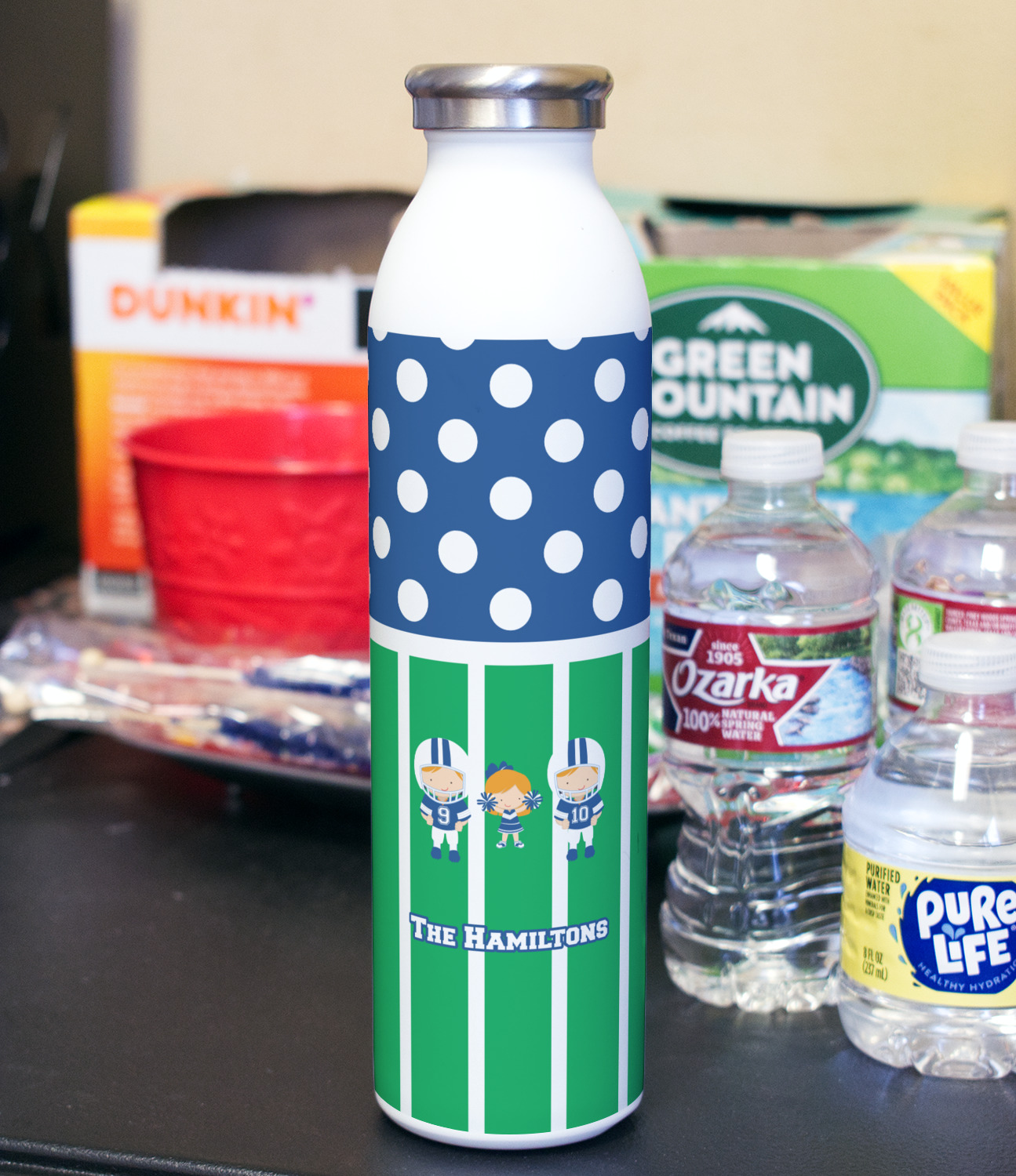 What a great way to showcase your kids and the love of football. A fun polka dot pattern on the top brings fun to the design, while the bottom is the football field. This design is so versatile. Whether you have a football player and a cheerleader, or two football players, or even two cheerleaders and one football player you can mix and match up to three kids.