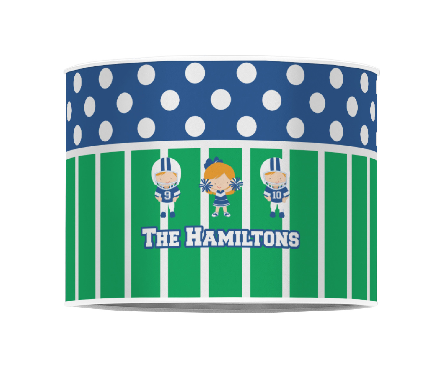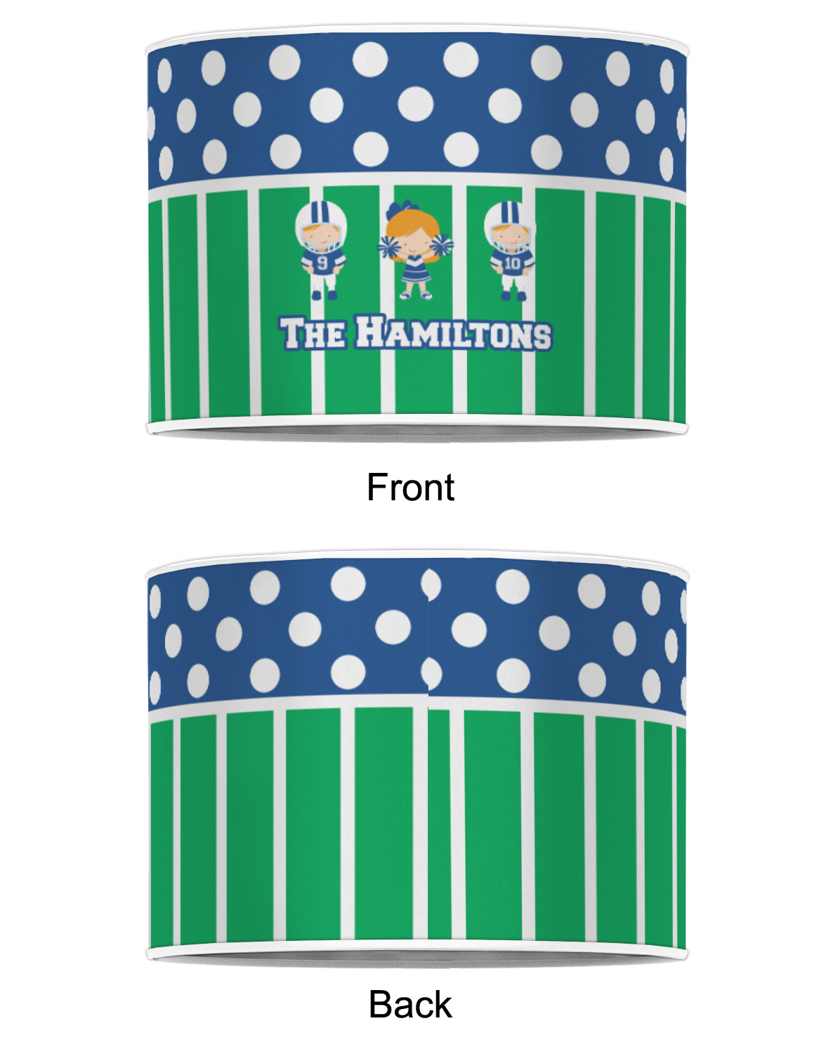 What a great way to showcase your kids and the love of football. A fun polka dot pattern on the top brings fun to the design, while the bottom is the football field. This design is so versatile. Whether you have a football player and a cheerleader, or two football players, or even two cheerleaders and one football player you can mix and match up to three kids.