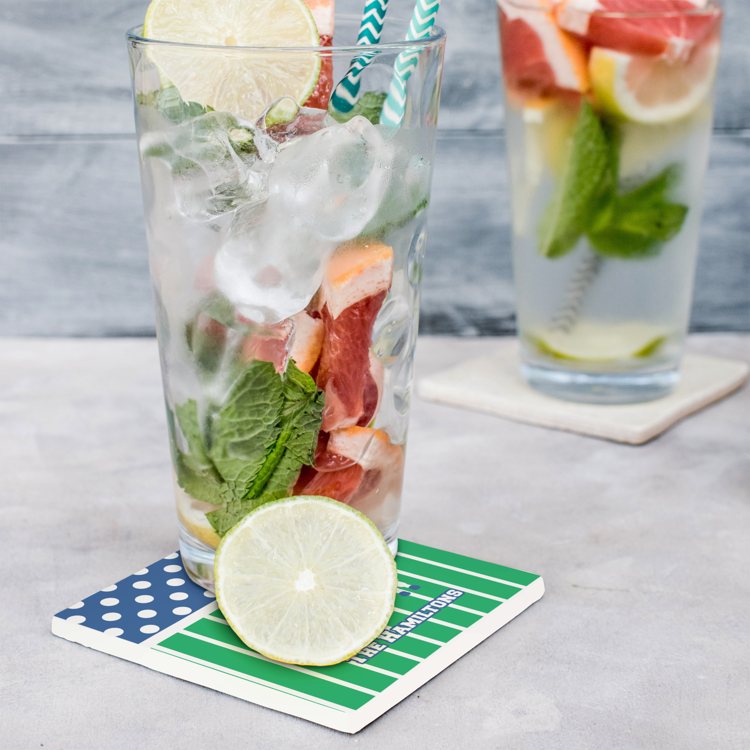 These customized stone coasters are perfect for use with beverages that are served in drinkware that "sweat". When cocktails, sodas, iced tea, water, etc. are served with ice in a regular glasses (non insulated glasses), they release condensation that drips down the outside of the glasses.