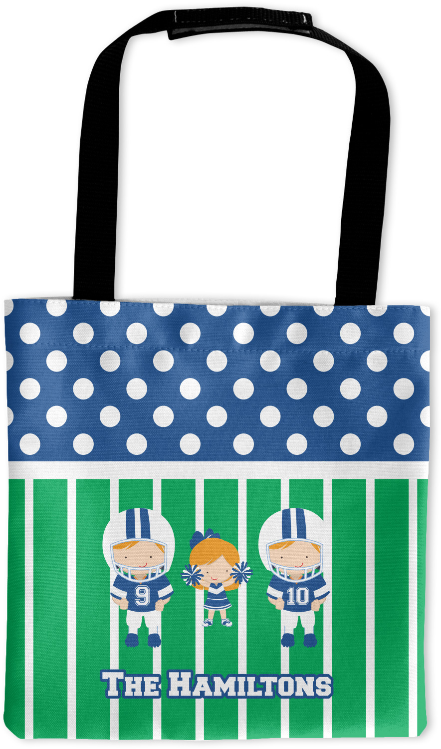 What a great way to showcase your kids and the love of football. A fun polka dot pattern on the top brings fun to the design, while the bottom is the football field. This design is so versatile. Whether you have a football player and a cheerleader, or two football players, or even two cheerleaders and one football player you can mix and match up to three kids.