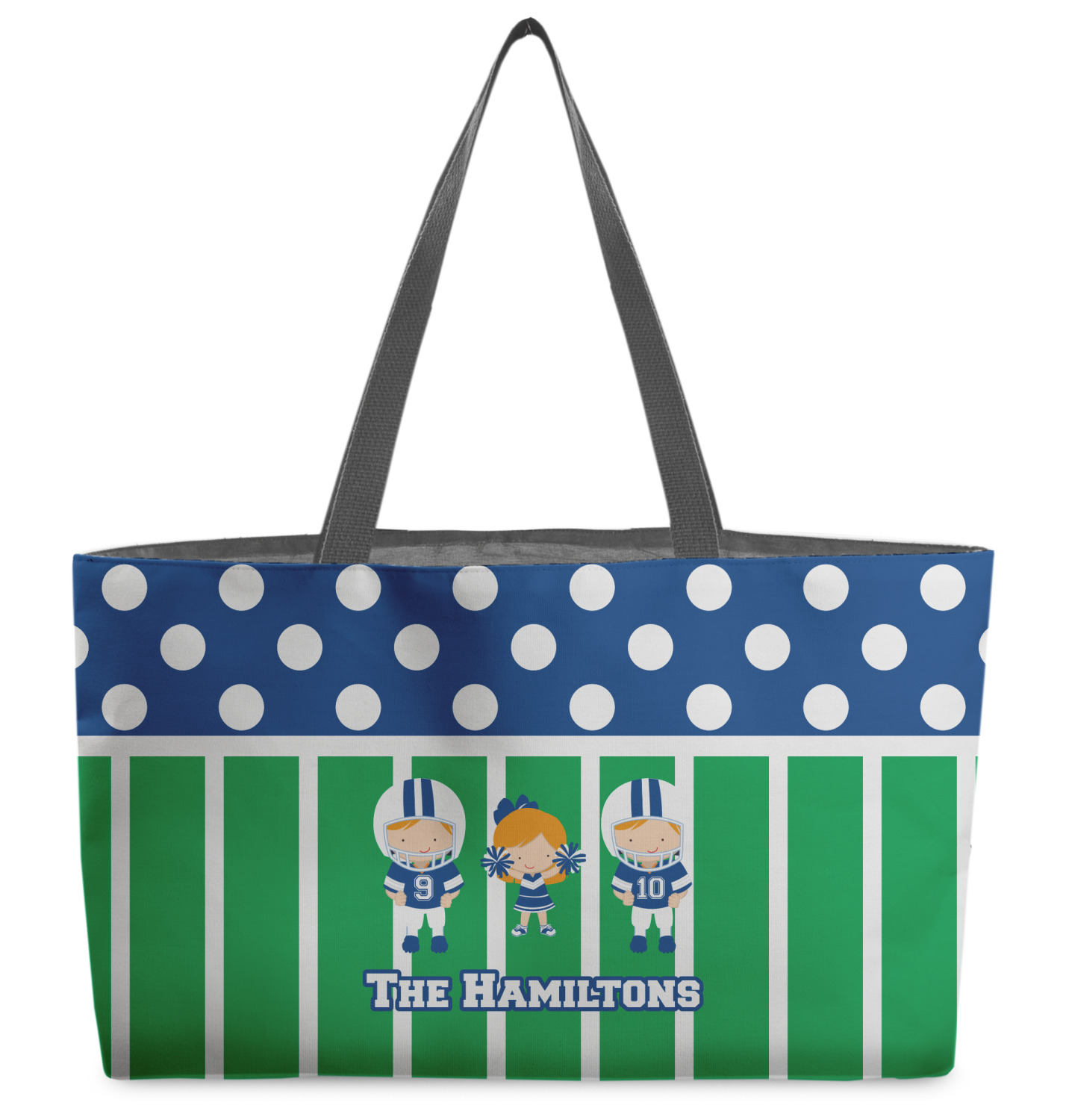 These beach totes are handmade here in the USA. Fabric is printed with your design. The tote is then sewn from the fabric pieces, lining and handles added.