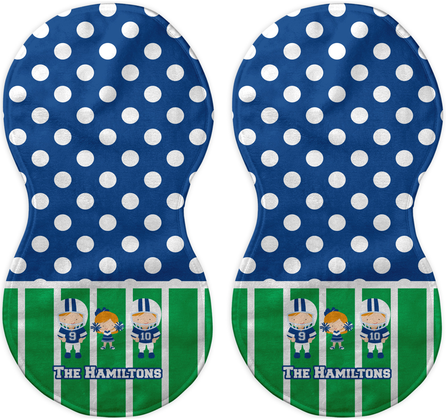 What a great way to showcase your kids and the love of football. A fun polka dot pattern on the top brings fun to the design, while the bottom is the football field. This design is so versatile. Whether you have a football player and a cheerleader, or two football players, or even two cheerleaders and one football player you can mix and match up to three kids.