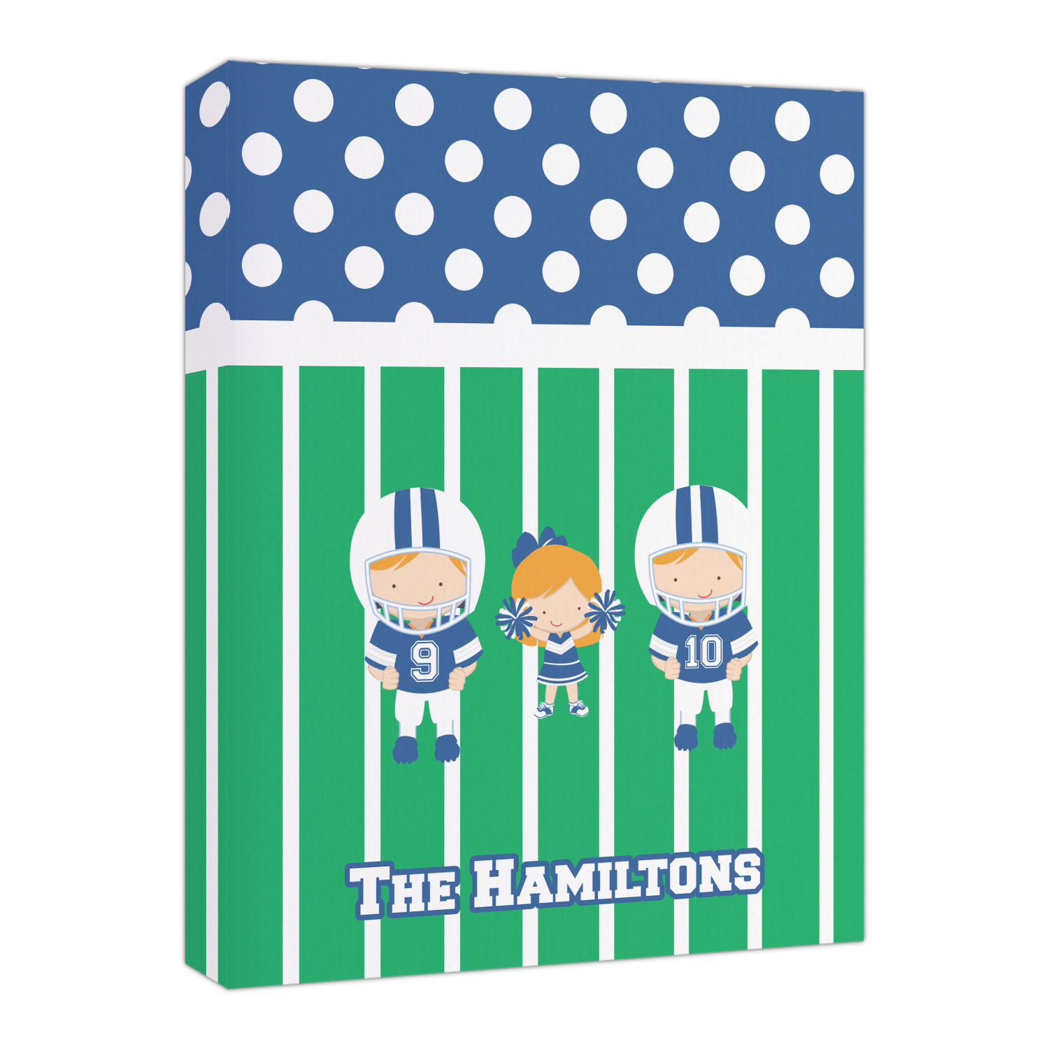 What a great way to showcase your kids and the love of football. A fun polka dot pattern on the top brings fun to the design, while the bottom is the football field. This design is so versatile. Whether you have a football player and a cheerleader, or two football players, or even two cheerleaders and one football player you can mix and match up to three kids.