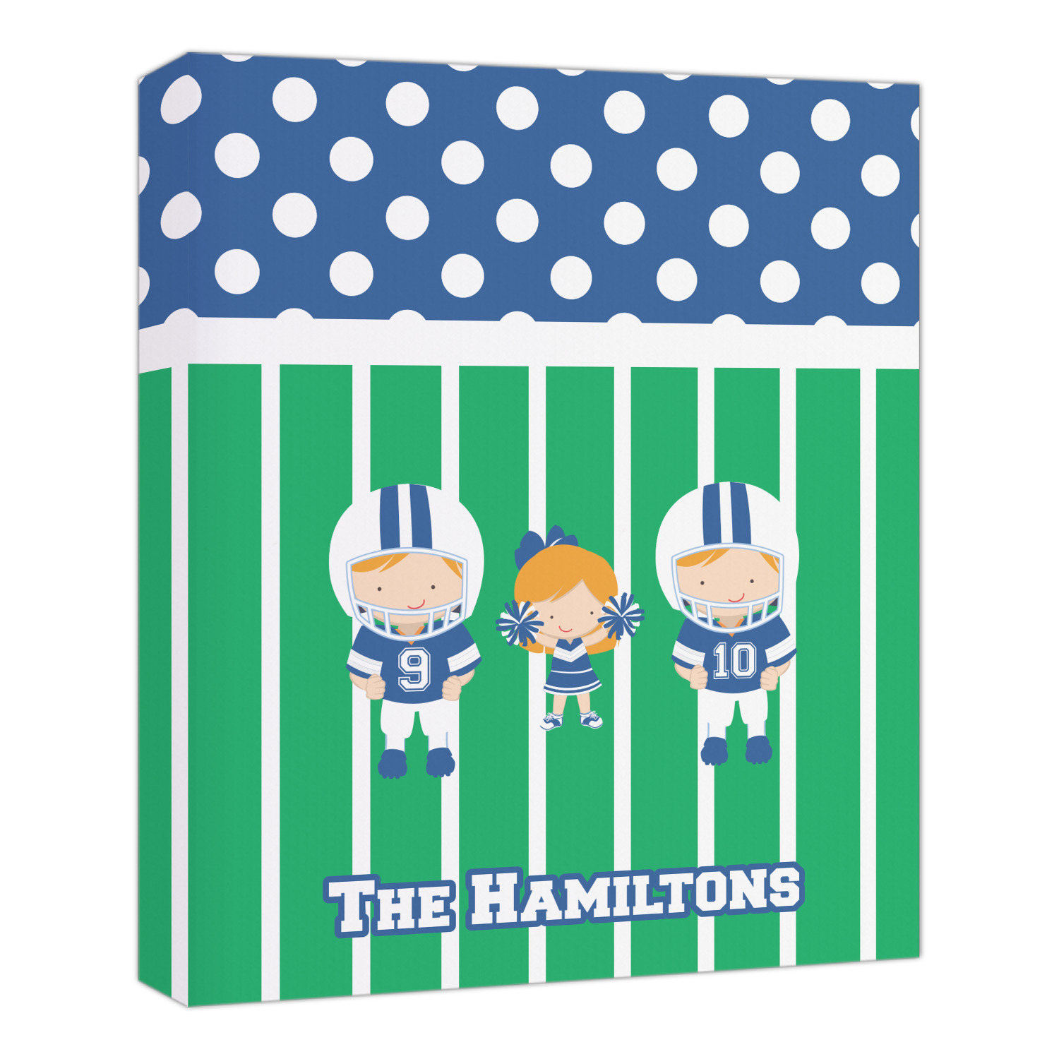 What a great way to showcase your kids and the love of football. A fun polka dot pattern on the top brings fun to the design, while the bottom is the football field. This design is so versatile. Whether you have a football player and a cheerleader, or two football players, or even two cheerleaders and one football player you can mix and match up to three kids.