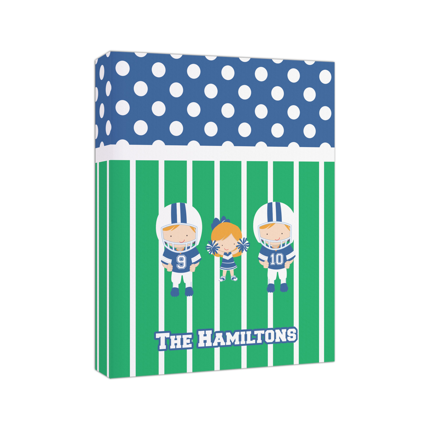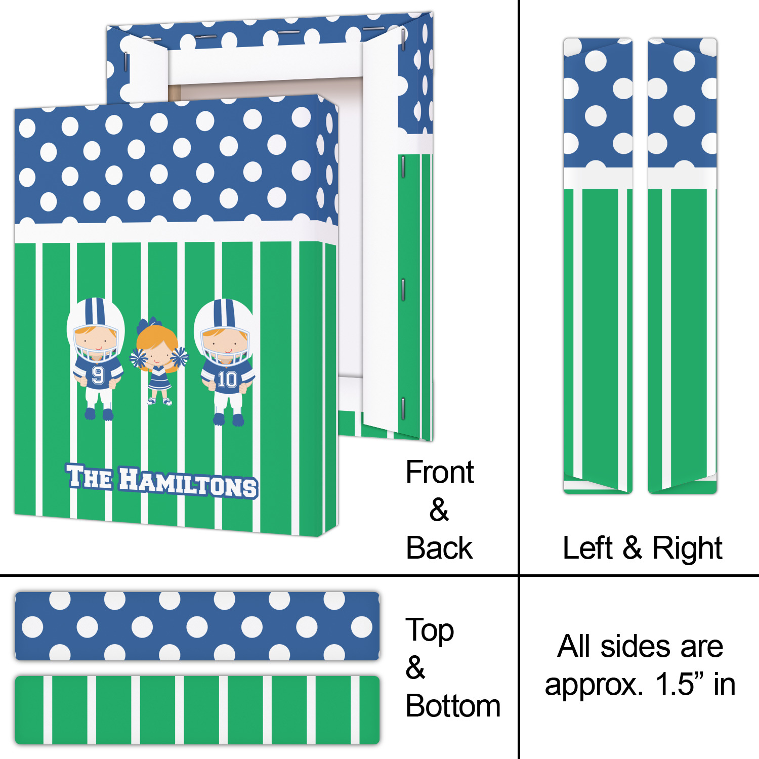 What a great way to showcase your kids and the love of football. A fun polka dot pattern on the top brings fun to the design, while the bottom is the football field. This design is so versatile. Whether you have a football player and a cheerleader, or two football players, or even two cheerleaders and one football player you can mix and match up to three kids.