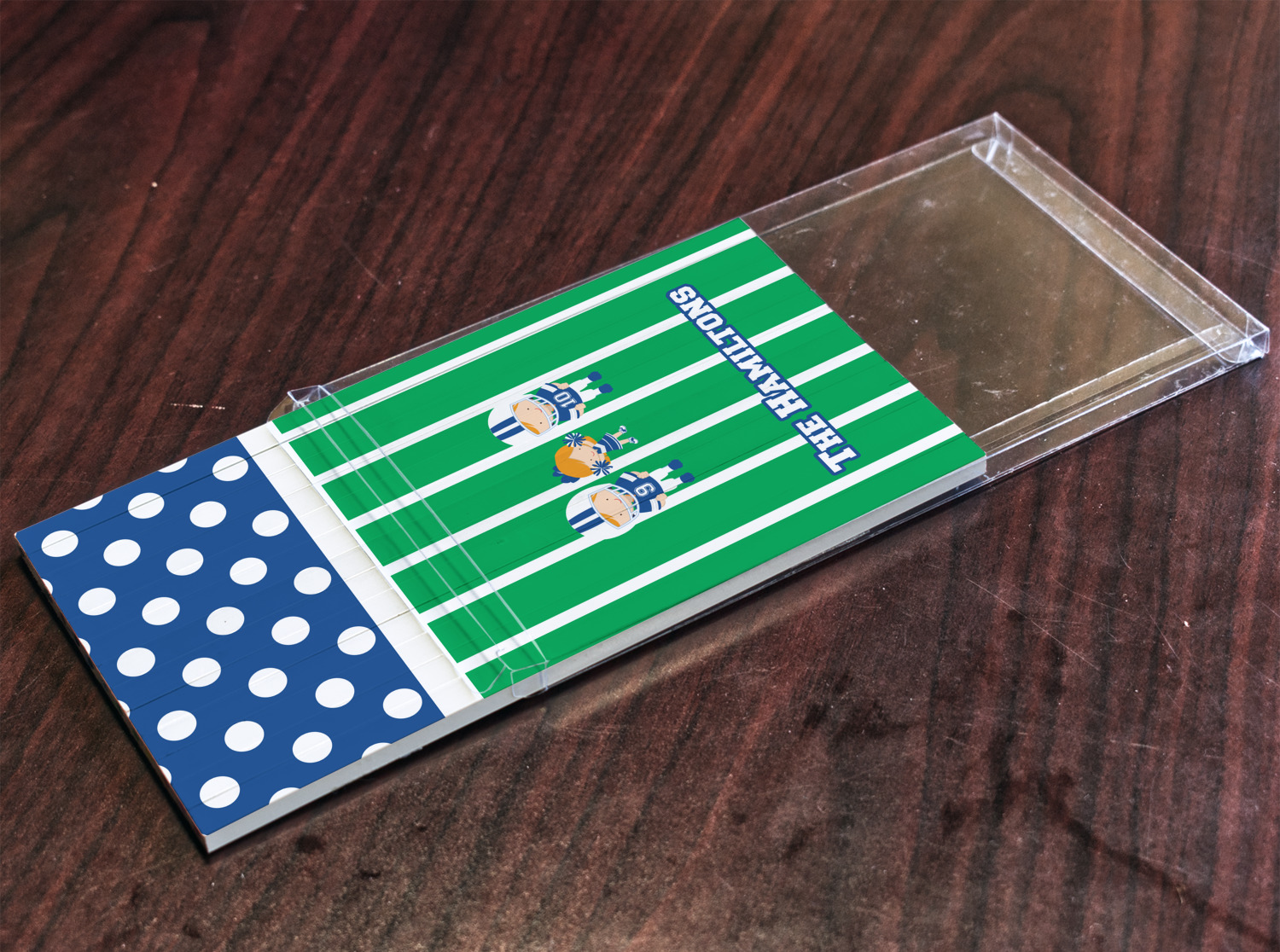 What a great way to showcase your kids and the love of football. A fun polka dot pattern on the top brings fun to the design, while the bottom is the football field. This design is so versatile. Whether you have a football player and a cheerleader, or two football players, or even two cheerleaders and one football player you can mix and match up to three kids.