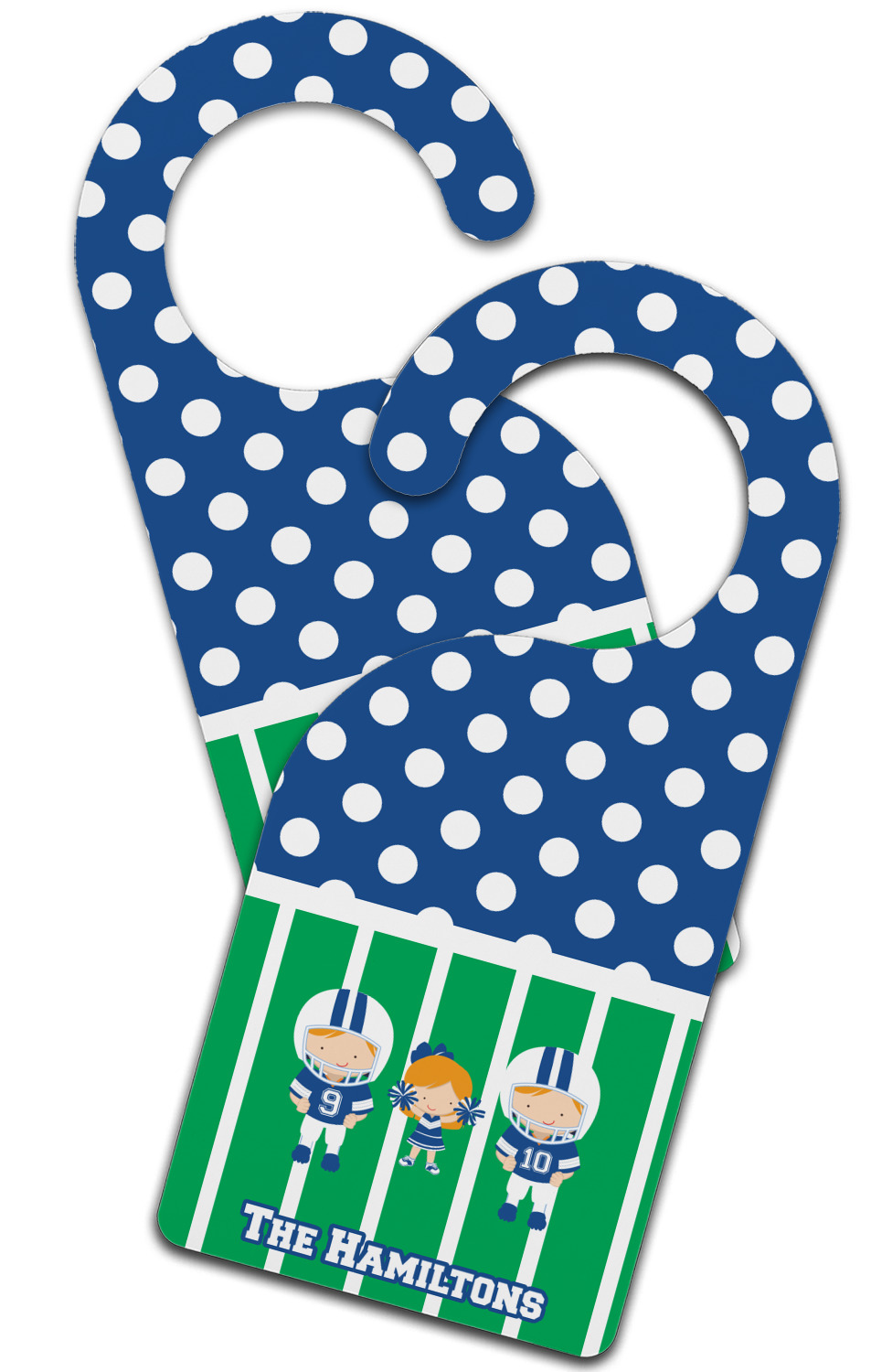 What a great way to showcase your kids and the love of football. A fun polka dot pattern on the top brings fun to the design, while the bottom is the football field. This design is so versatile. Whether you have a football player and a cheerleader, or two football players, or even two cheerleaders and one football player you can mix and match up to three kids.