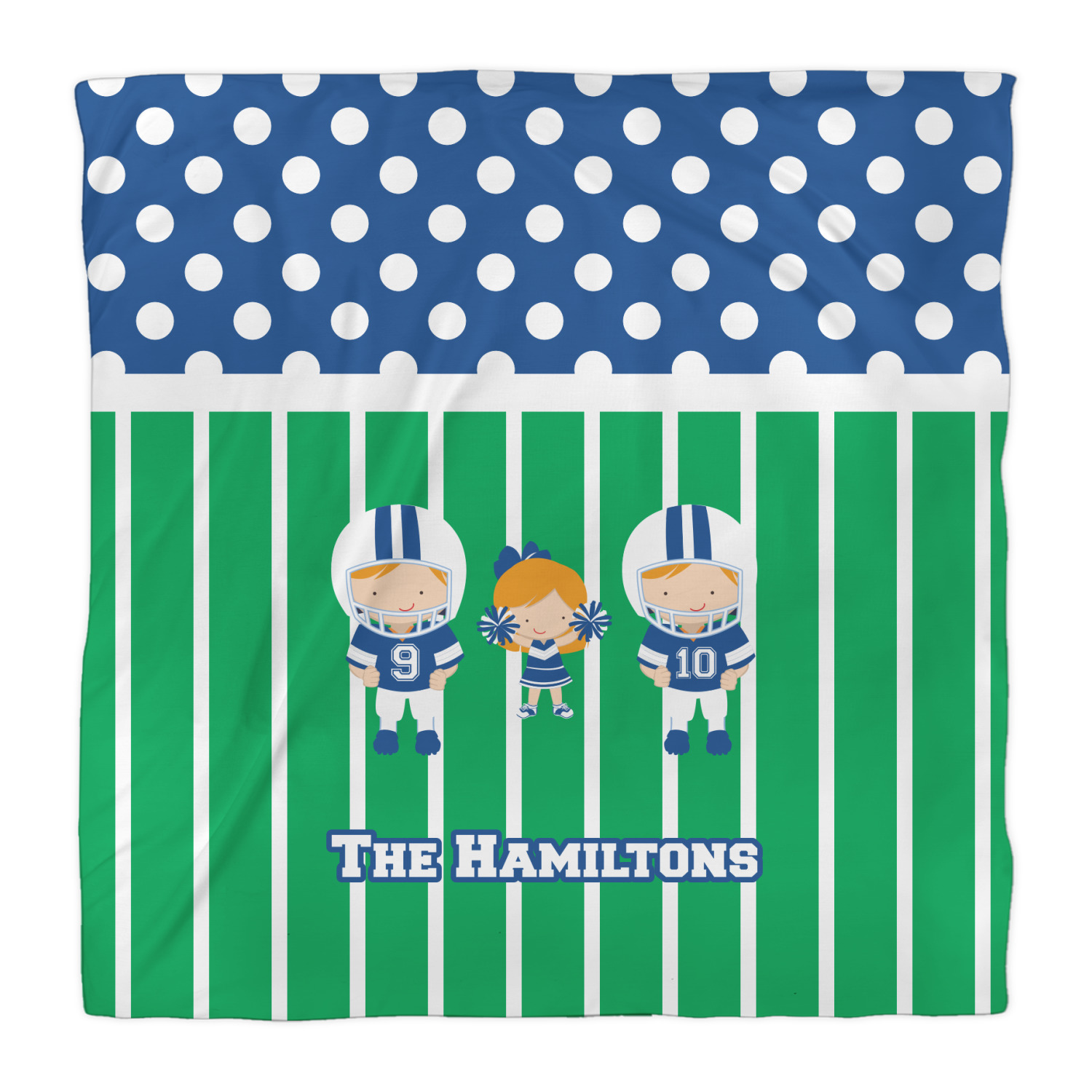 What a great way to showcase your kids and the love of football. A fun polka dot pattern on the top brings fun to the design, while the bottom is the football field. This design is so versatile. Whether you have a football player and a cheerleader, or two football players, or even two cheerleaders and one football player you can mix and match up to three kids.