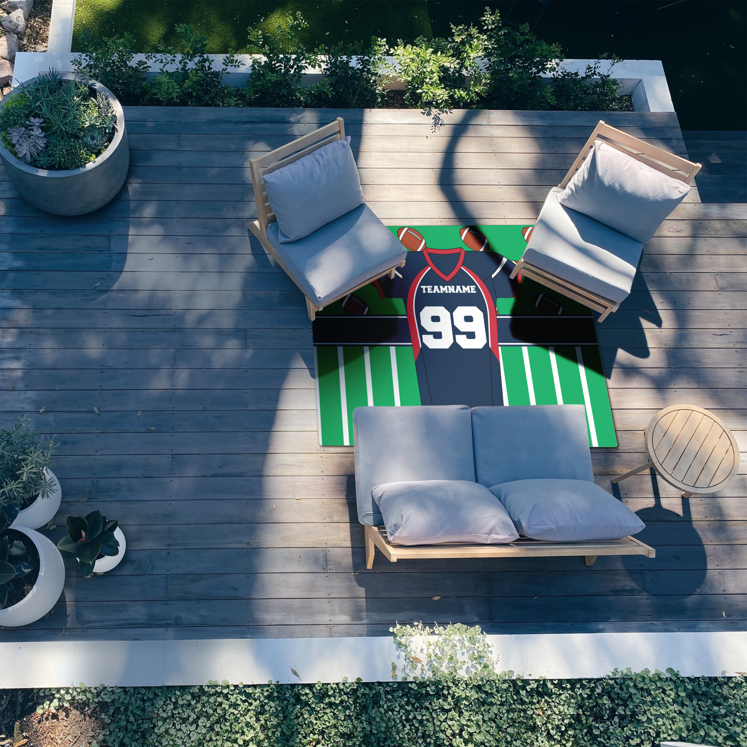 Our custom patio area rugs are velvety soft and smooth, with a short pile, beautiful sewn corners and edges for a refined and exquisite finished look. The poly chenille face is printed with your design and is sure to brighten up any room with its fabulous look. They have just enough cushion to feel comfortable under foot but not soak up water in the weather and offer a quick drying material.