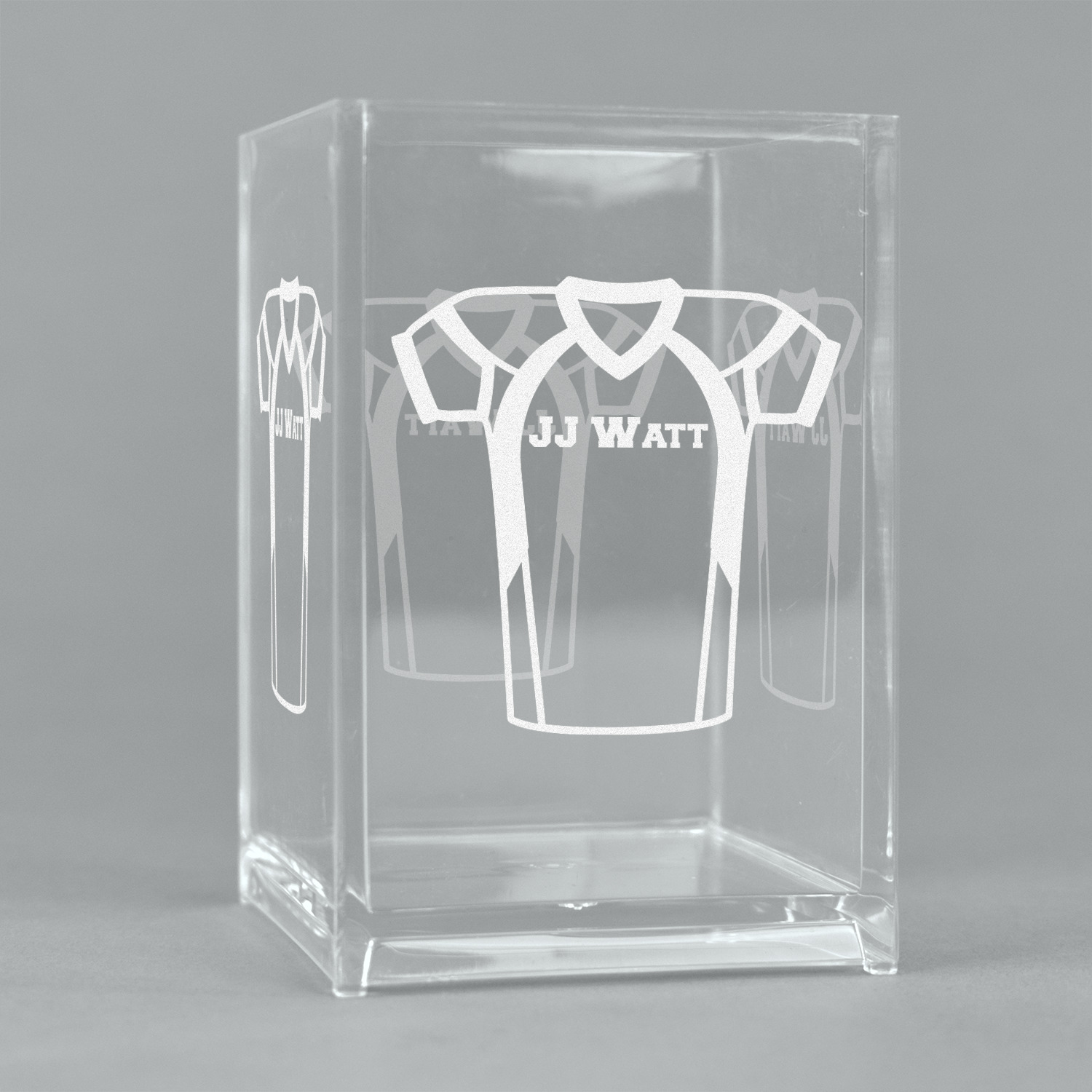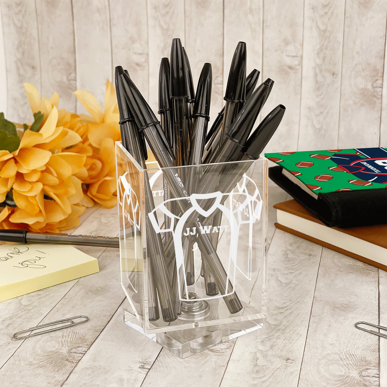 Add a great accessory to your desk with one of these acrylic pen holders. A great way to store your writing utensils, and personalized to suit your needs.