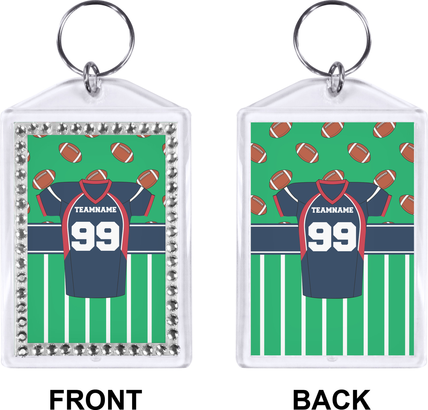 Our personalized keychains have a bold, rectangular shape, outlined by a series of shimmering rhinestones. A metal, split keyring is included with your purchase, and an additional metal hoop allows for attachment of the keychain to the split ring. This unique keychain measures at about 3.75 by 2.5 inches. We print your customized design(s) across both the back and front of this keychain.