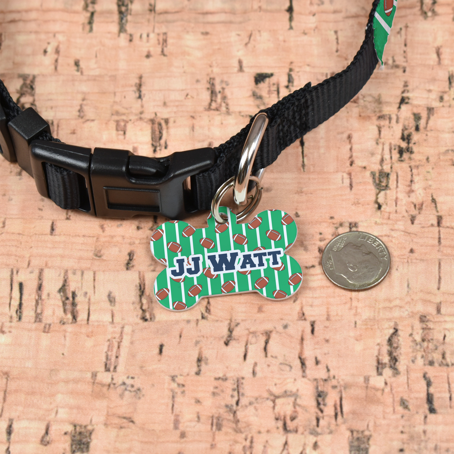 The small bone dog tag size is perfect to pair with our small dog collars, the large size pairs well with our large dog collars.