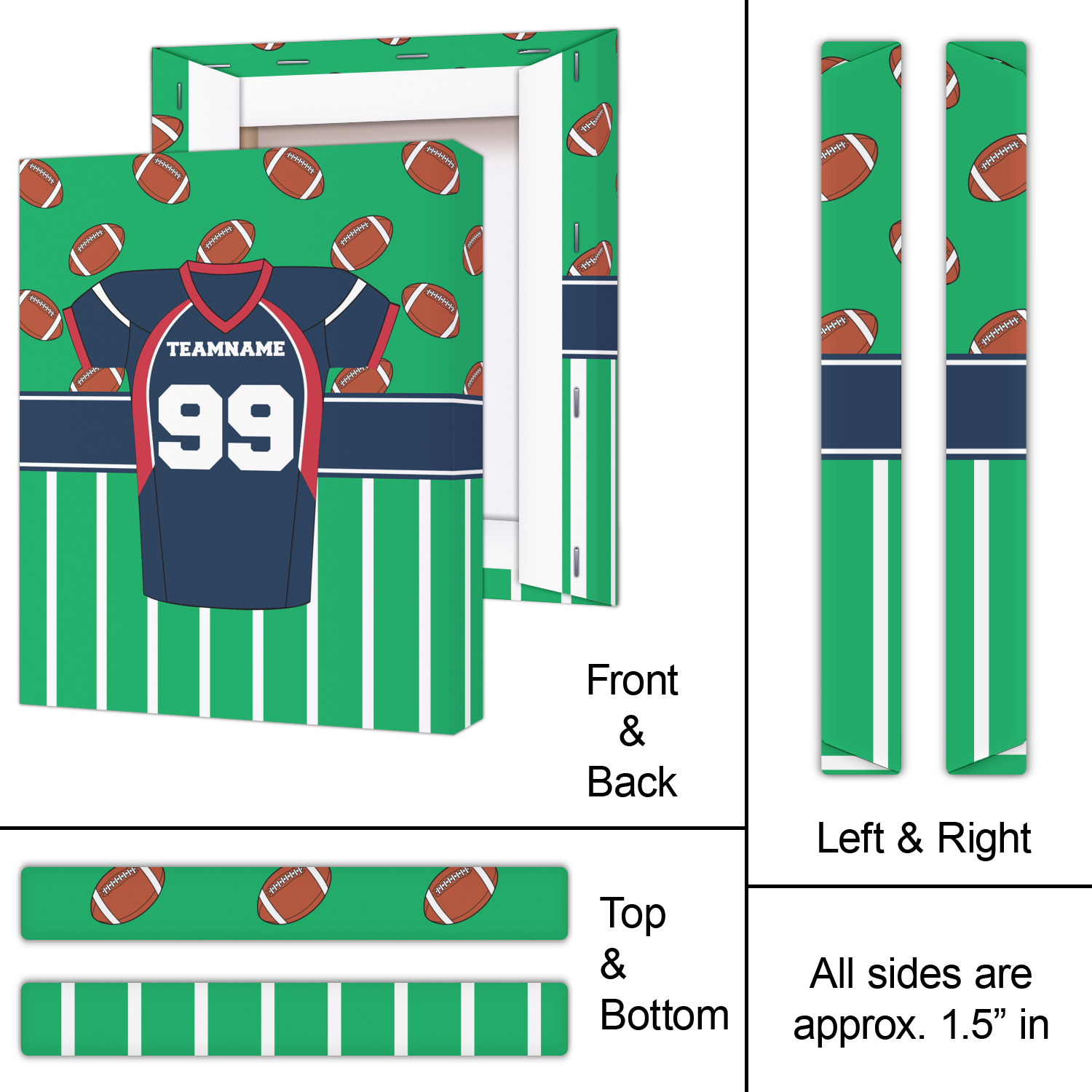 Easily change the navy, white, and blue to your favorite team's colors. The footballs and green field are a fun background pattern, which can be easily changed as well!