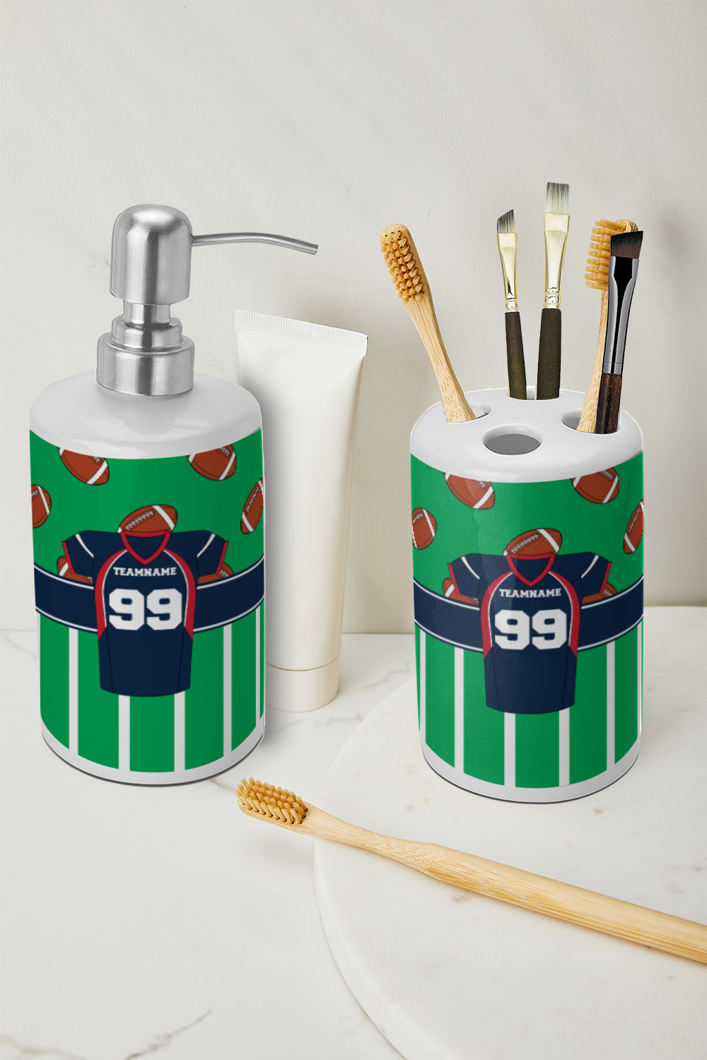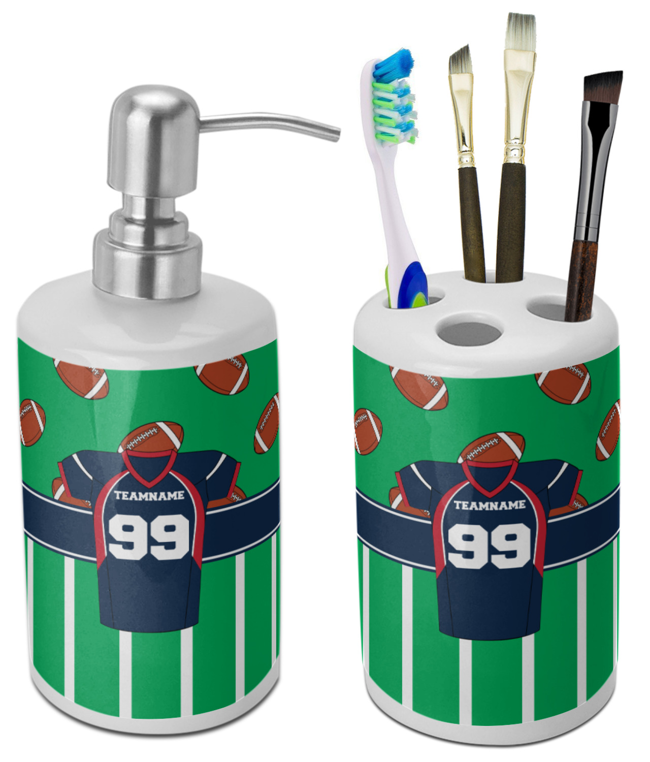 Easily change the navy, white, and blue to your favorite team's colors. The footballs and green field are a fun background pattern, which can be easily changed as well!