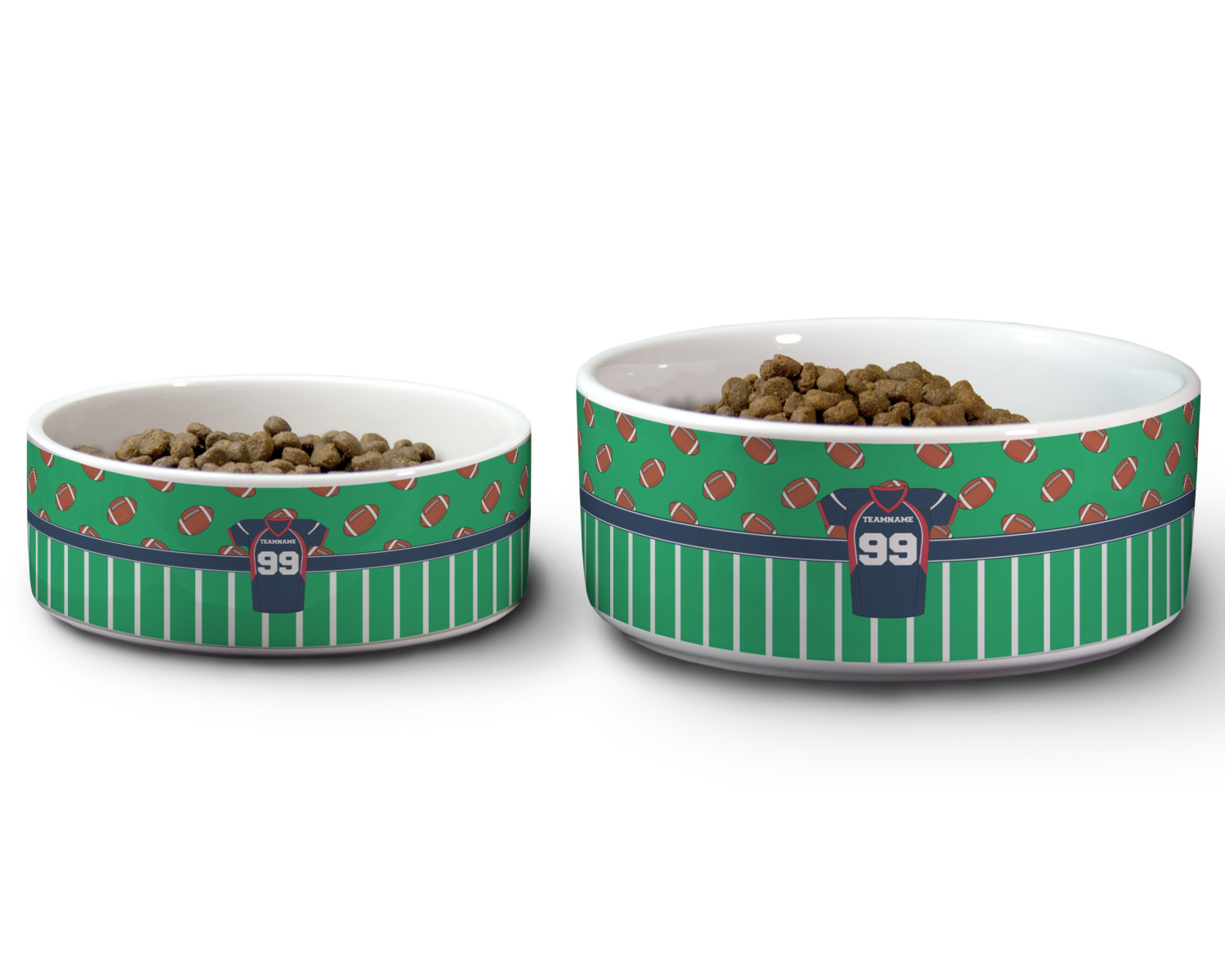 We carry these custom dog bowls in two available sizes: medium and large.The medium is 6 inches in diameter and 2.5 inches tall, and can therefore suit pets who eat up to 2.5 cups of food per meal. The large pet bowl is 7 inches in diameter and 3 inches tall, and suits pets who require up to 4.5 cups of food per meal.