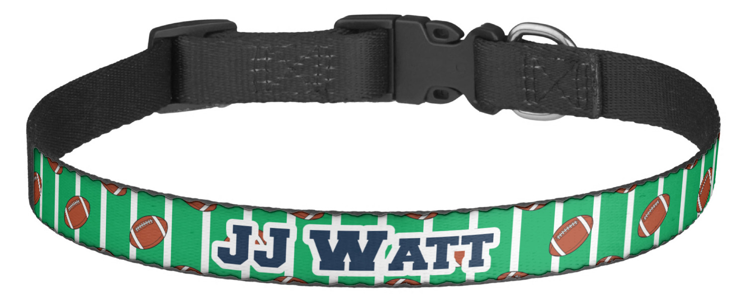 This sturdy collar, made from a durable nylon weave, will outlive your dog's episodes of excited tugging and pulling. Courtesy of its thick plastic buckle and adjuster, this collar is adjustable and accommodating of any dog. Structurally, the collar is a single piece of nylon weave that is sewn together, and features a solid metal loop where you can attach a leash or dog tag. We print and display your dog's name and pattern across the middle of the personalized dog collar.