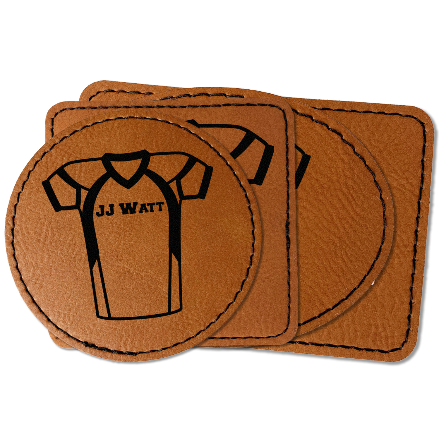 Our leather patches come in 4 different shapes - Square (3" x 3"), Round (3" x 3"), Oval (3.5" x 2.5"), Rectangle (3.5" x 2.5") and a beautiful rich brown rawhide or cognac color.