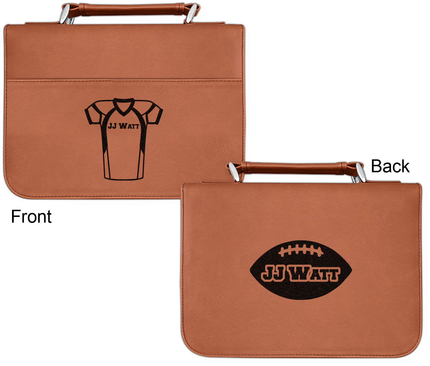 These book covers are fabricated from a fine leatherette in a warm, cognac shade of brown. A wide pocket spans across the front of the book jacket [2,400] and can store any loose papers or notes that you wish to keep. The interior of this personalized Bible cover includes slots on both sides to house the covers of your Bible, and keep it in place. The inside of the spine has a small elastic band to secure a pen. A zipper lines three sides of the cover, while the fourth side features a reinforced handle that allows for easy transport of your enclosed book.