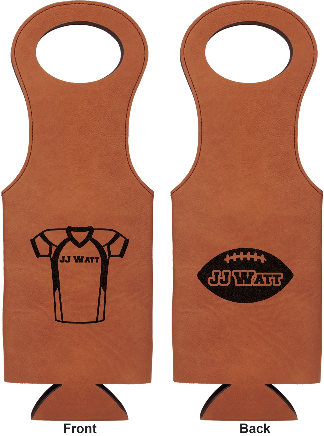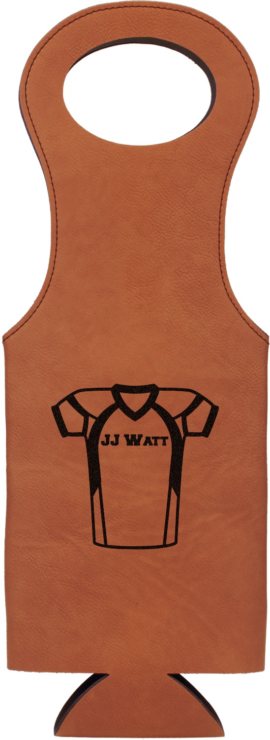 This wine carrier is made from a stunning leatherette, in a cognac-brown color. Strong, black stitching lines the sides of your wine bottle bag and provides extra durability. The interior is lined with a padded, black material to allow for a snug fit once your bottle is placed inside. At the top of this wine gift bag, you'll find two oval shaped handles that elegantly complements the rest of the bag's style. We provide you with the option of laser-engraving the front, or the front and back of your new personalized wine bag!