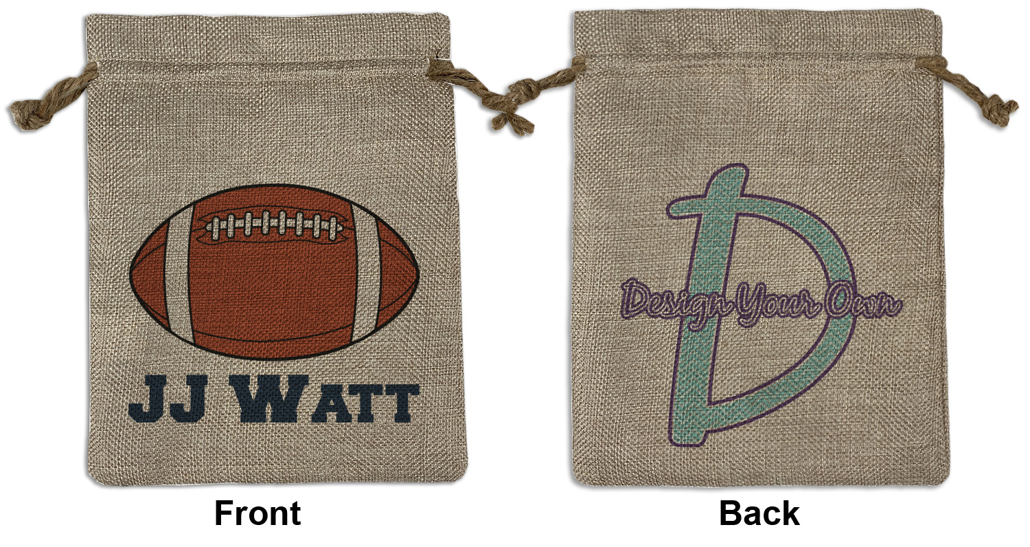 We sell our Burlap Gift Bags in 3 variant sized bags. Made with burlap polyester, each personalized bag can be secured with a twine drawstring pull. Your custom design is available to print on one side or both sides - completely up to you! The sizes of the bags measure approximately 4.5" x 6.5" for the smallest size, 6.5" x 8.0" for the medium size, and 6.5" x 13.5" for the large-sized bag.