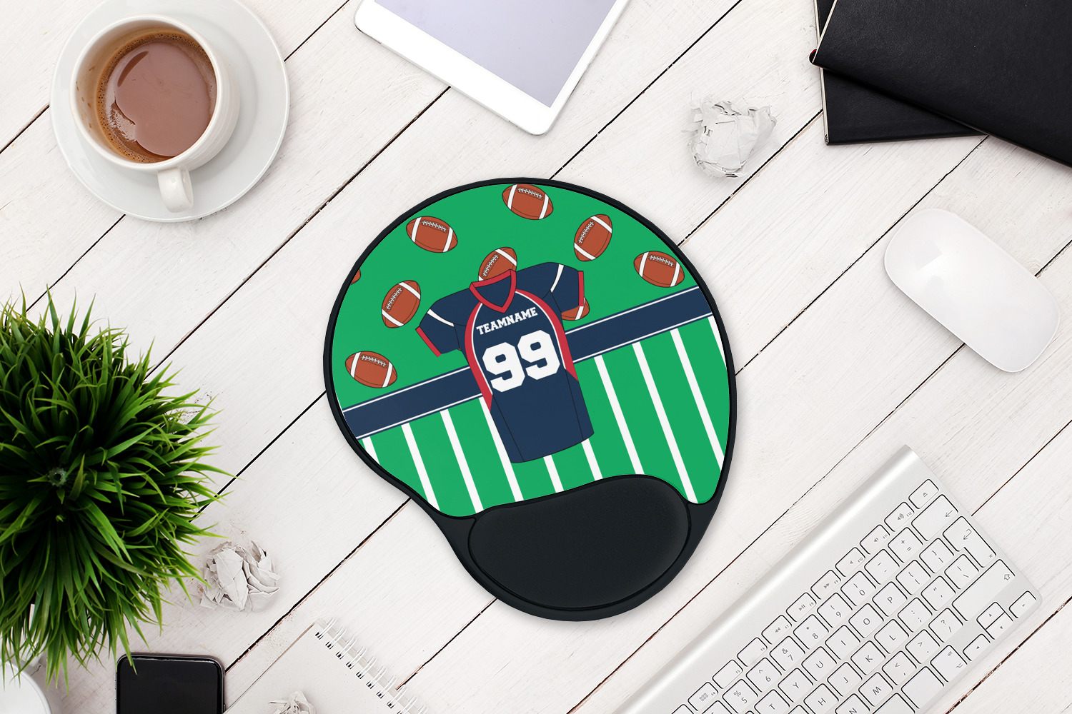 Easily change the navy, white, and blue to your favorite team's colors. The footballs and green field are a fun background pattern, which can be easily changed as well!