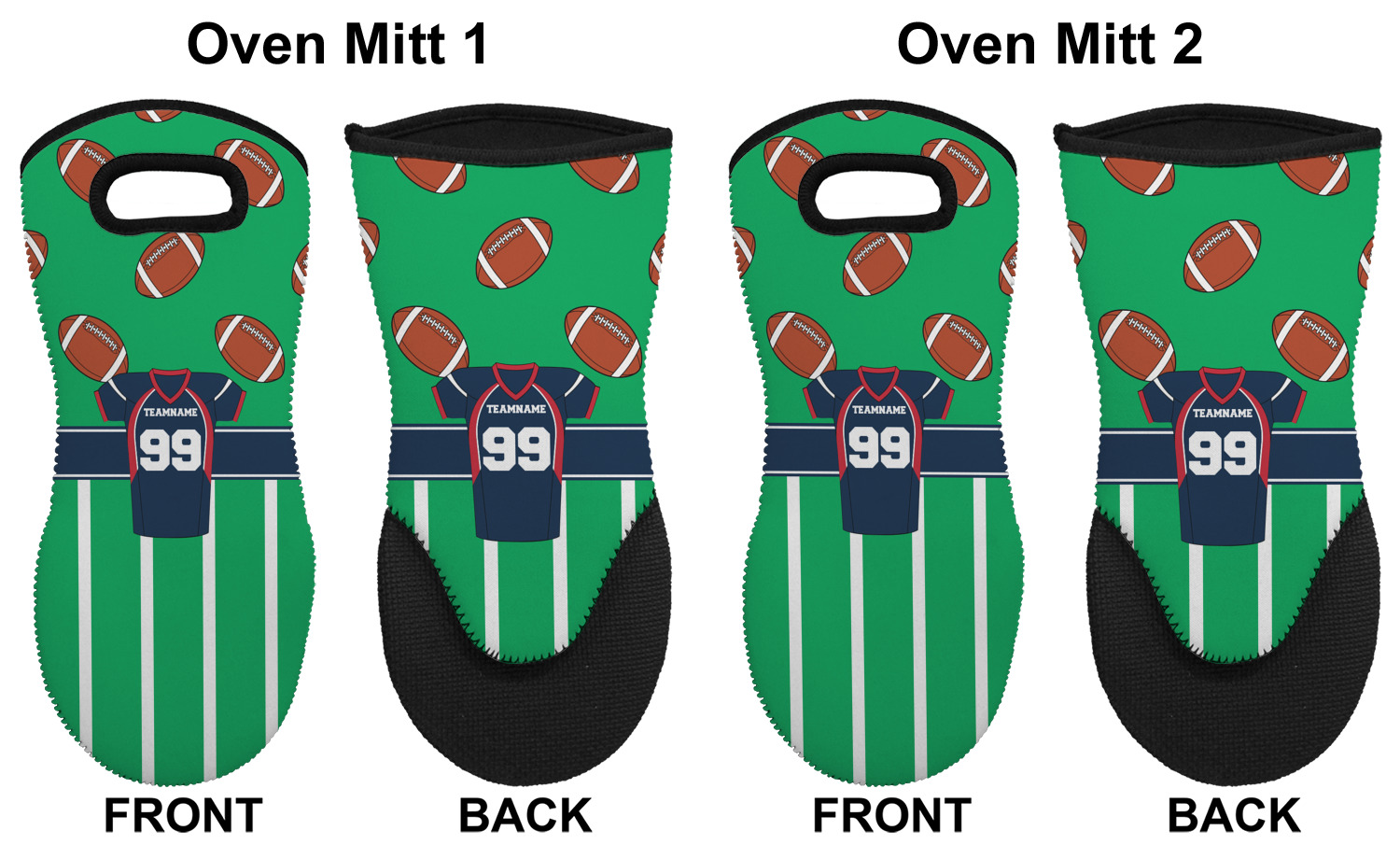 These heat resistant gloves are made entirely of a durable neoprene; the front features a softer texture, while the palm's side has a textured surface, meant to handle heat up to 500 degrees Fahrenheit. Thick, heavy duty stitching connects the two sides. A small, oval cutout appears on the front, and can be used to hang and store the mitt. Your personalization appears on the front, and the upper part of the back of the mitt. The style of these oven mitts are suitable for both the right and left hand, depending on your needs. If you need one for each hand, be sure to order two!