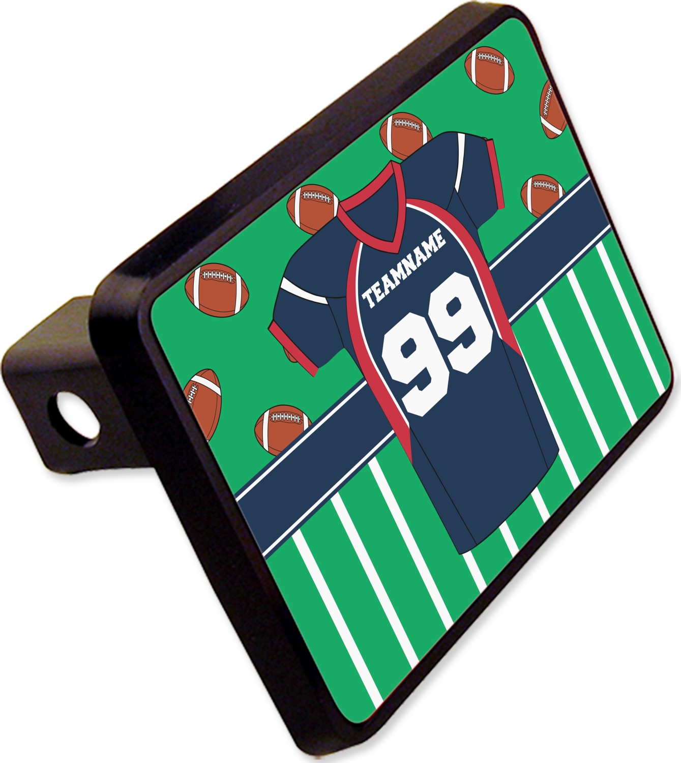 Our receiver hitch covers are molded, durable, and available in a size that fits 2in., square receiver holes. This model is best suited for a Class 3 or Class 4 hitch, but please consult our hitch sizing guide to make an informed purchase. We print your design on the surface of the rectangular cover, while the rest of the cover is a sleek, black color. The design's vibrancy will last up to 2 years in harsh sunlight. Designed for easy attachment, the cover slides easily into your trailer hitch and can be secured using a pin (not included).