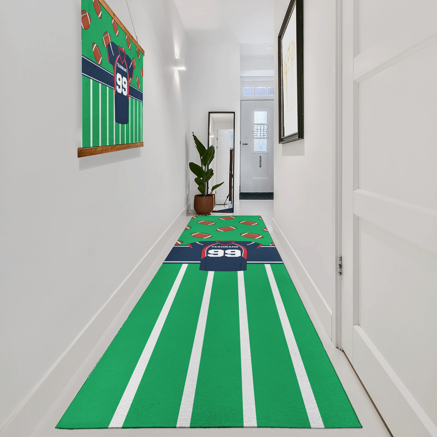 Our custom runner rugs and area rugsare both velvety soft and smooth, with a short pile, beautiful sewn corners and edges on the poly chenille face. We recommend adding an anti-slip mat under your runner rug to prevent it from sliding when under foot when placed on hard or smooth surfaces.
