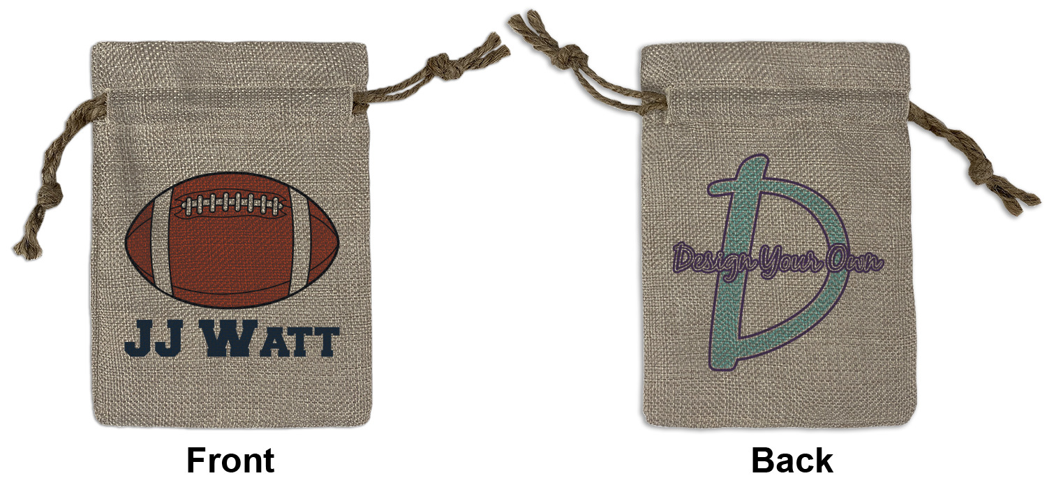 We sell our Burlap Gift Bags in 3 variant sized bags. Made with burlap polyester, each personalized bag can be secured with a twine drawstring pull. Your custom design is available to print on one side or both sides - completely up to you! The sizes of the bags measure approximately 4.5" x 6.5" for the smallest size, 6.5" x 8.0" for the medium size, and 6.5" x 13.5" for the large-sized bag.