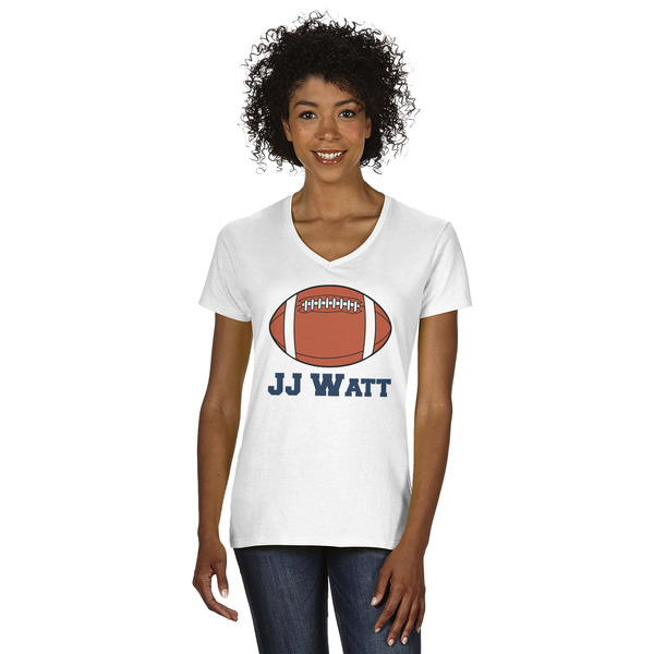 Introducing our versatile Women's V-neck shirt, tailored for a flattering missy contoured silhouette. Crafted from premium 5.3 oz. USA cotton with sustainable practices, it features cap sleeves and a tear-away label for added convenience. With sizes catering to all, enjoy comfort and style in every wear.