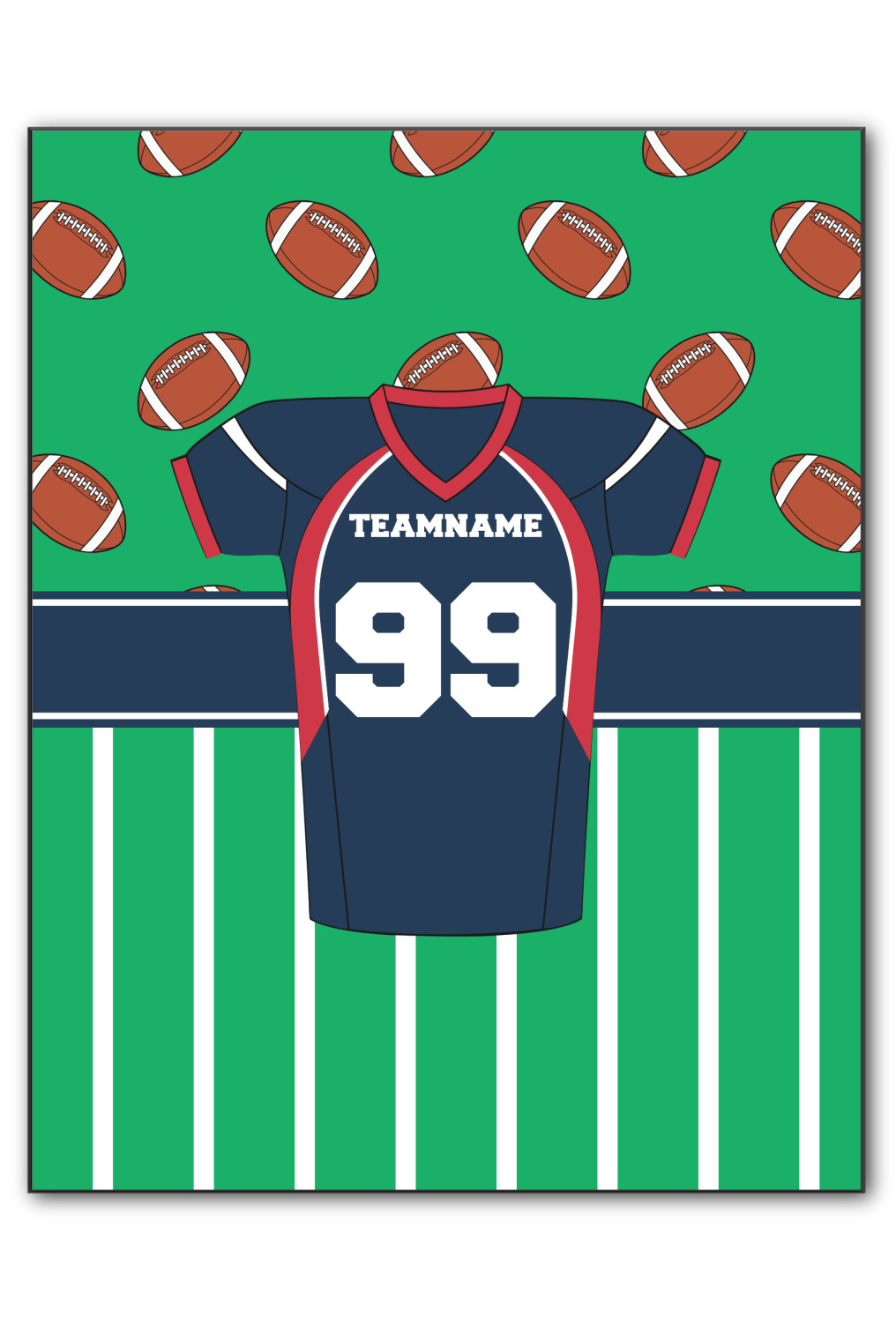 Easily change the navy, white, and blue to your favorite team's colors. The footballs and green field are a fun background pattern, which can be easily changed as well!