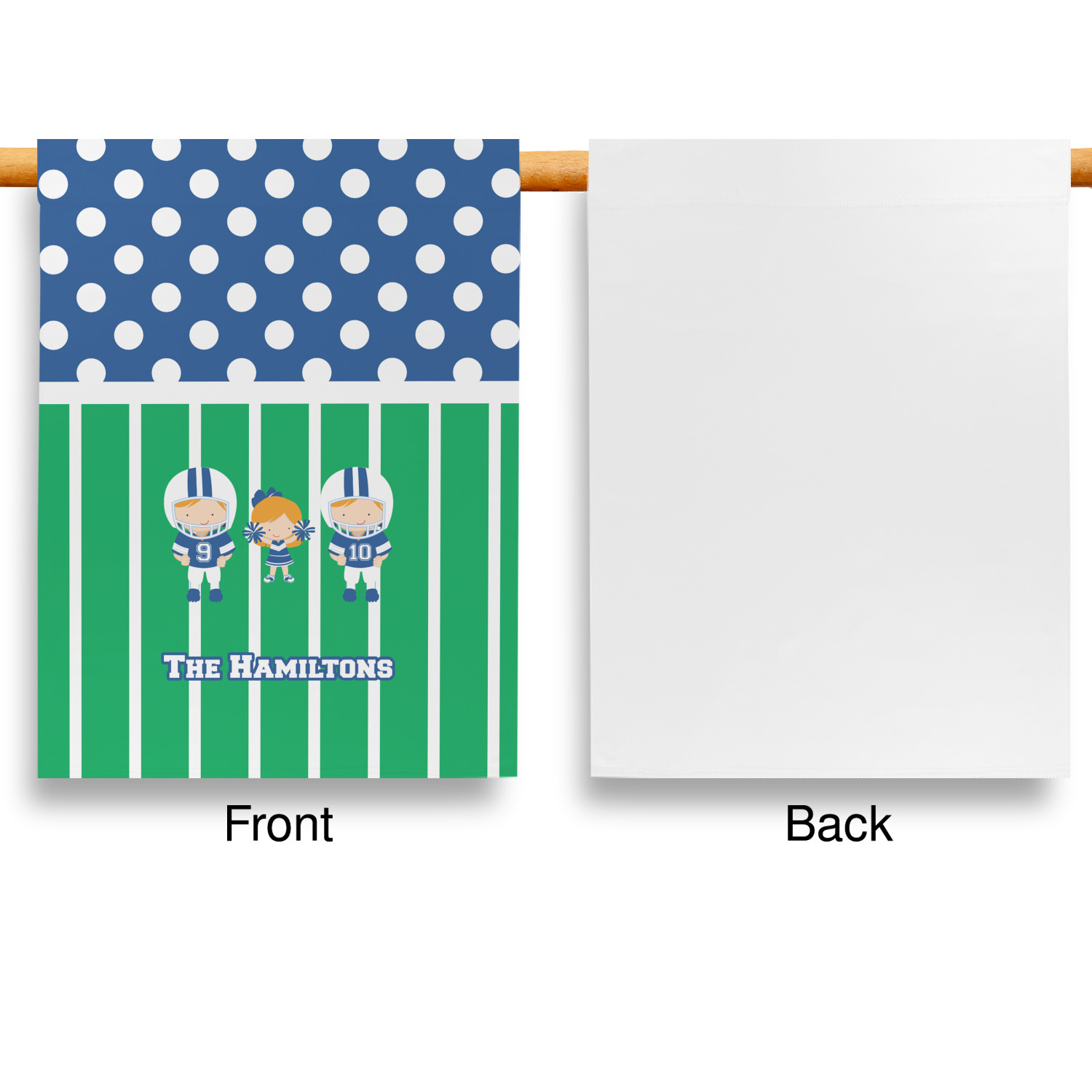 These custom garden flags are made of a durable, double-ply, polyester weave, allowing them to withstand the elements year round. The small flags measure at approximately 12 by 18 inches. The large flags measure out to 28 by 37 inches. You can order these decorative flags with your customization printed on the front only, or the front and back.