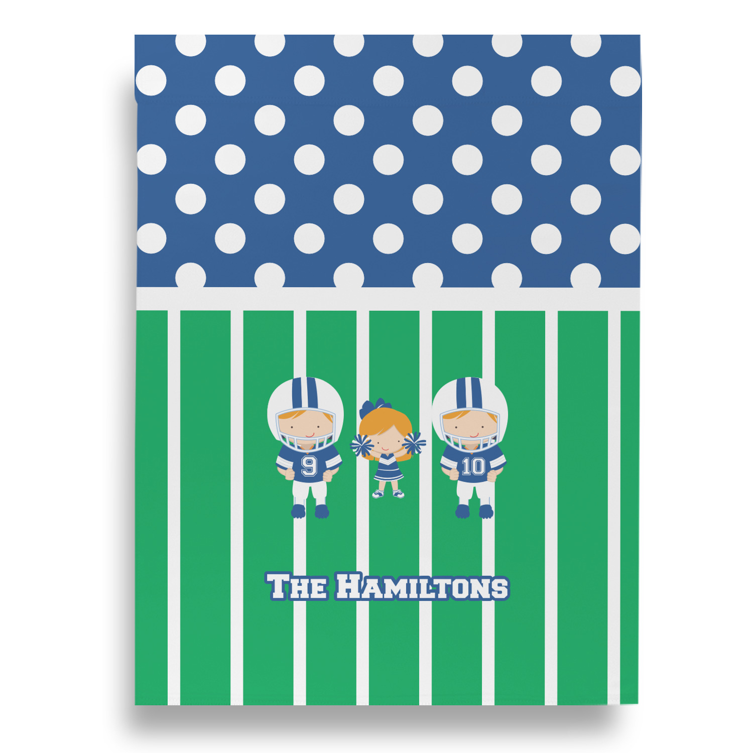 What a great way to showcase your kids and the love of football. A fun polka dot pattern on the top brings fun to the design, while the bottom is the football field. This design is so versatile. Whether you have a football player and a cheerleader, or two football players, or even two cheerleaders and one football player you can mix and match up to three kids.