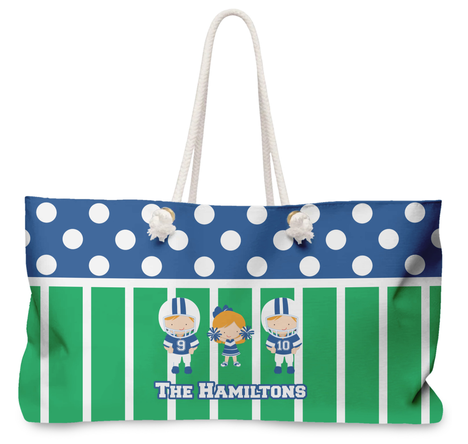 Our oversized weekender tote with rope handles is perfect for your weekend at the beach or on the town. This large tote are 24" W X 13" H, with a 5" gusset and a 27" thick rope handles with a knot that is put through a grommeted brass hole.