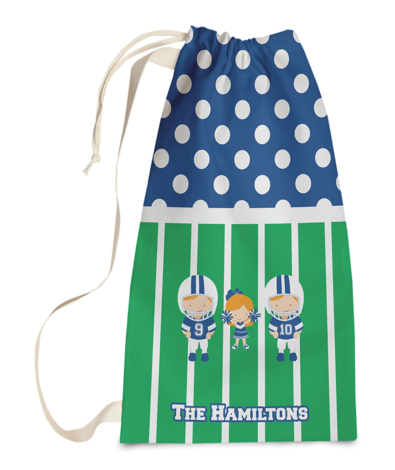 Carry your laundry in style with these customized laundry bags. Available in two sizes, featuring a natural colored woven strap and a cinch cord, these bags hold a lot of clothes or anything else you want to fit in them.