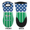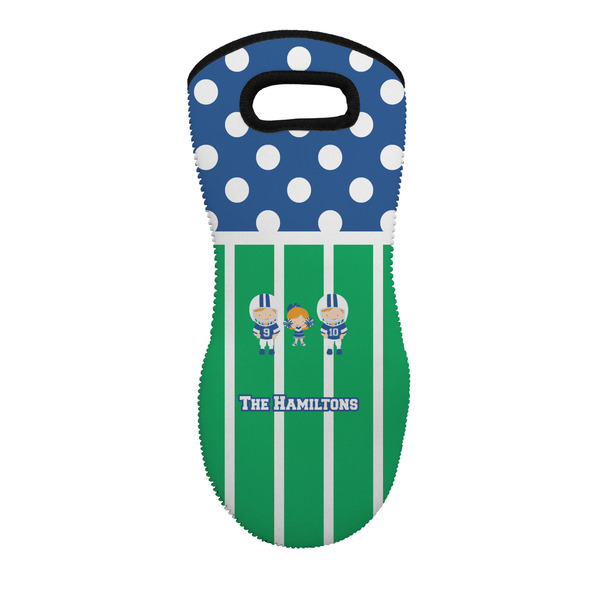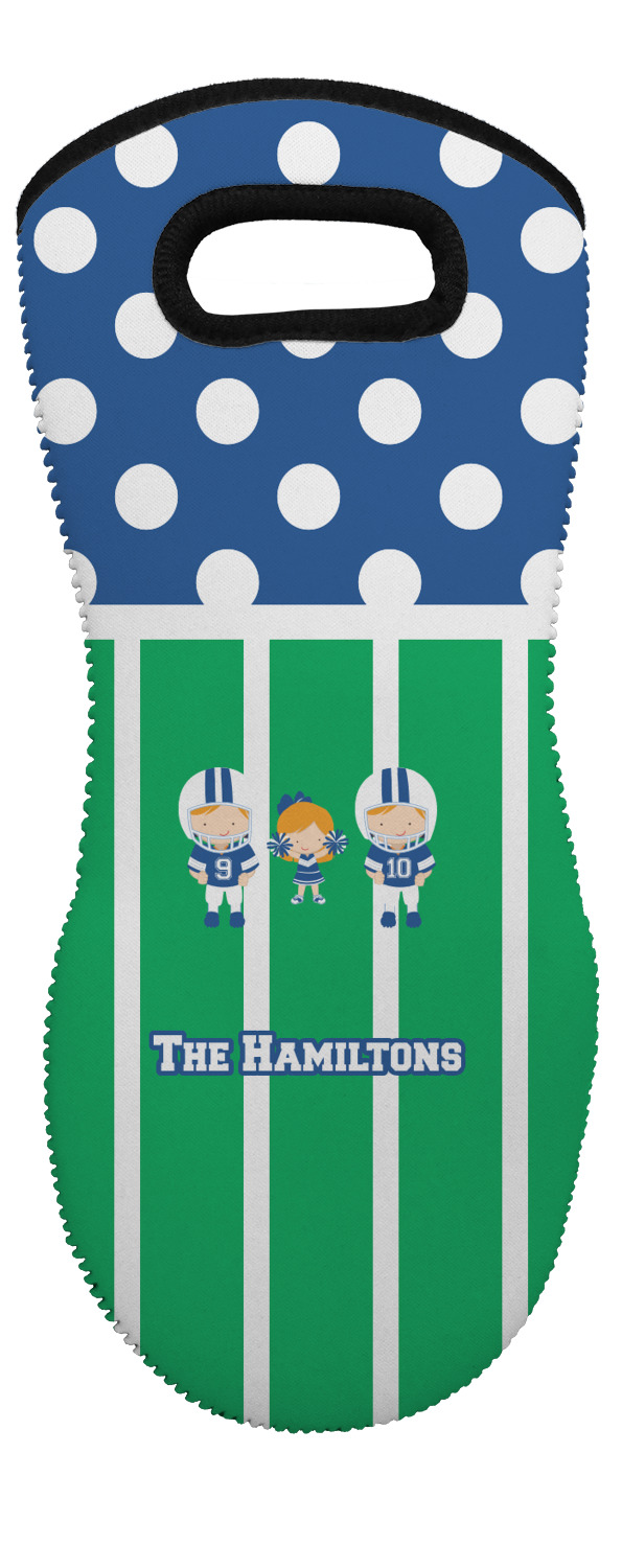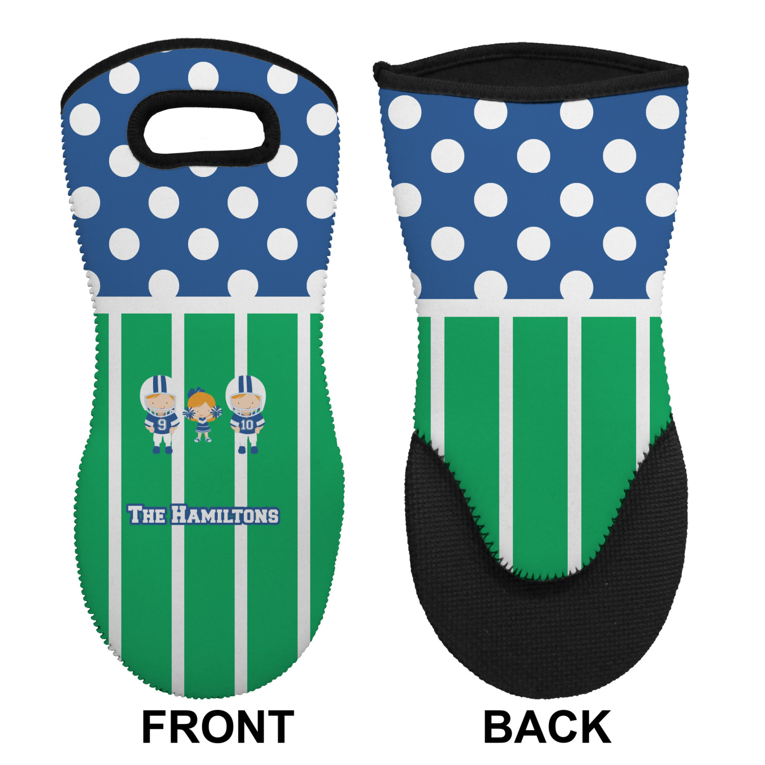 These heat resistant gloves are made entirely of a durable neoprene; the front features a softer texture, while the palm's side has a textured surface, meant to handle heat up to 500 degrees Fahrenheit. Thick, heavy duty stitching connects the two sides. A small, oval cutout appears on the front, and can be used to hang and store the mitt. Your personalization appears on the front, and the upper part of the back of the mitt. The style of these oven mitts are suitable for both the right and left hand, depending on your needs. If you need one for each hand, be sure to order two!