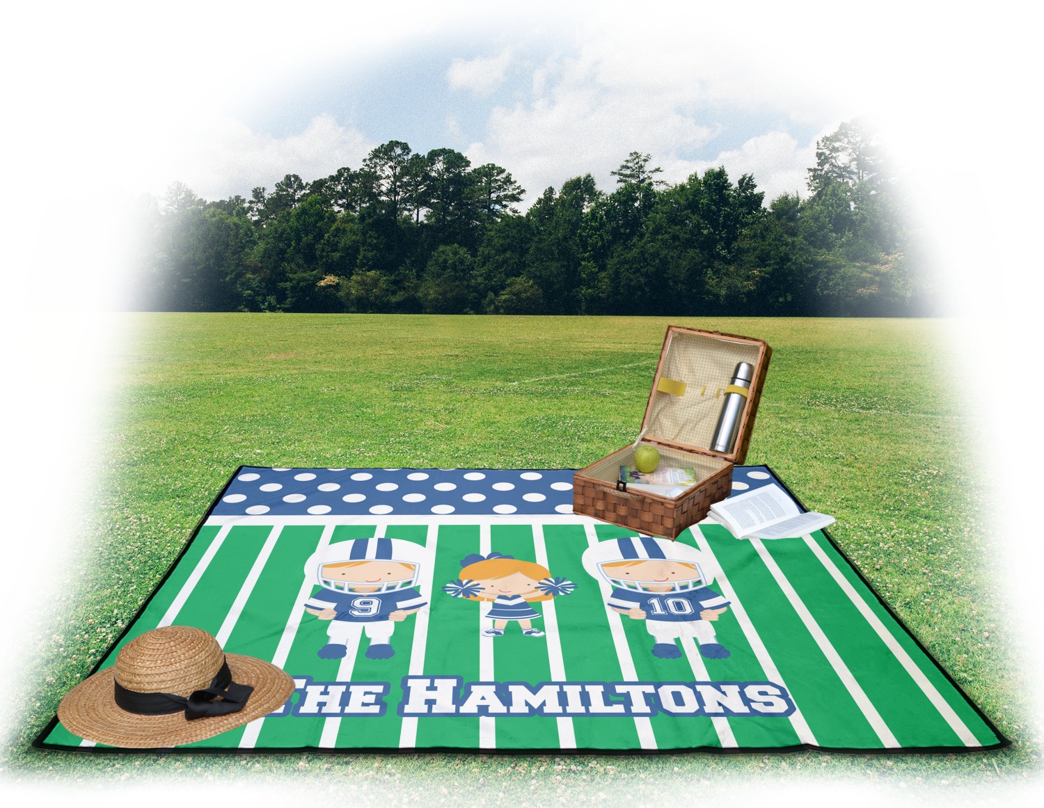 This picnic blanket is perfect for hanging out with your friends at the park or anywhere outside. The top of the blanket is made of a super soft microfiber fleece. The bottom of the blanket is made of a black material similar to a rain jacket and is water repellent as well. This will keep any wet spots on the ground from soaking through your picnic blanket. No one likes a wet blanket. The blanket measures at approximately 50" x 59" and has a nicely finished ribbon edge.