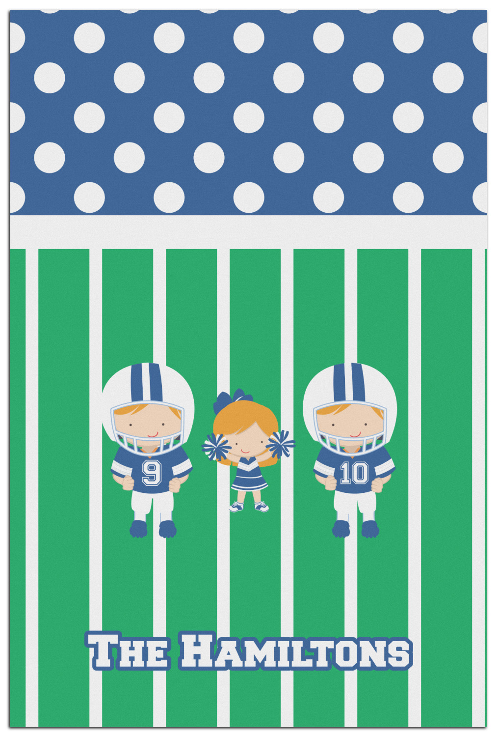What a great way to showcase your kids and the love of football. A fun polka dot pattern on the top brings fun to the design, while the bottom is the football field. This design is so versatile. Whether you have a football player and a cheerleader, or two football players, or even two cheerleaders and one football player you can mix and match up to three kids.