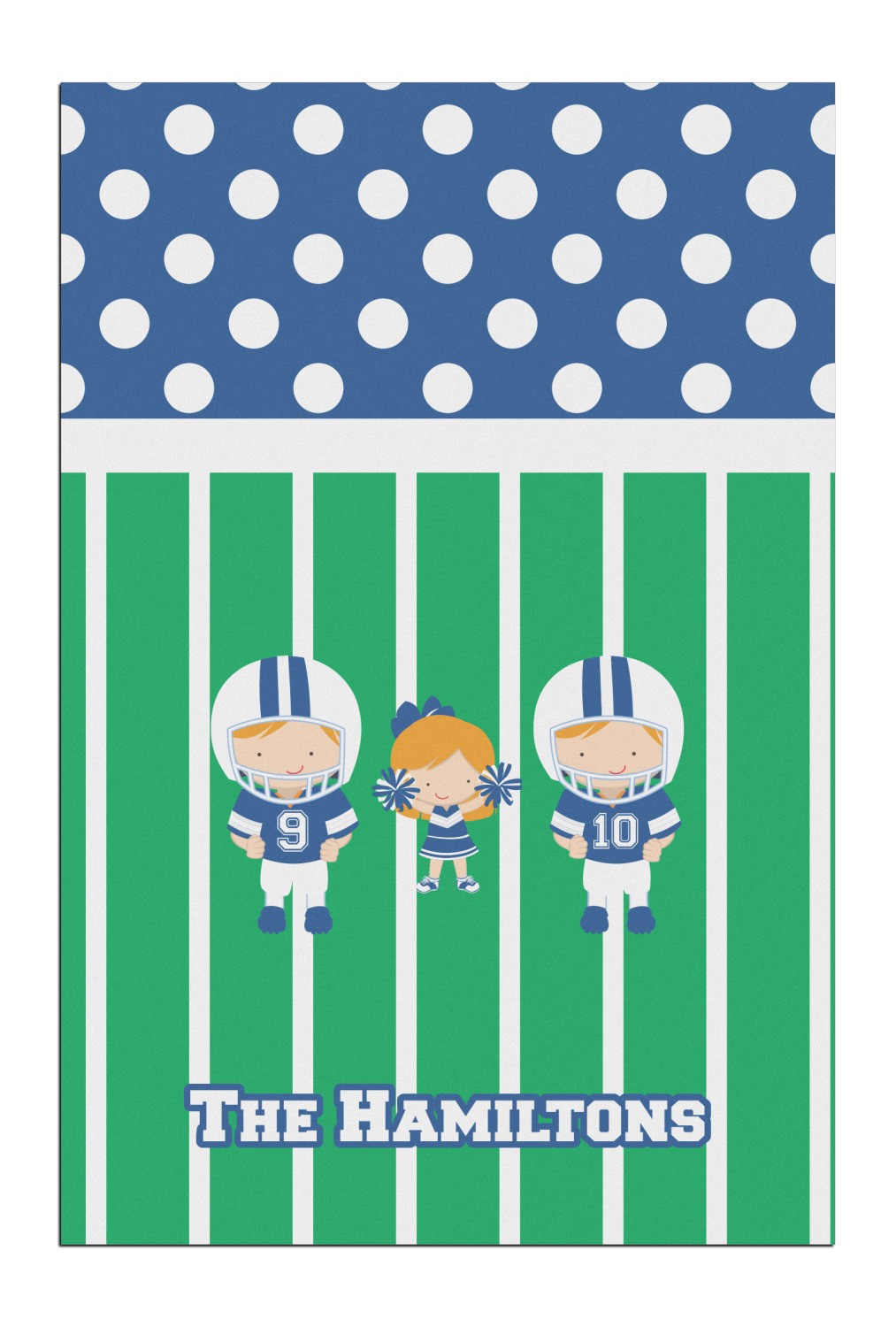 What a great way to showcase your kids and the love of football. A fun polka dot pattern on the top brings fun to the design, while the bottom is the football field. This design is so versatile. Whether you have a football player and a cheerleader, or two football players, or even two cheerleaders and one football player you can mix and match up to three kids.