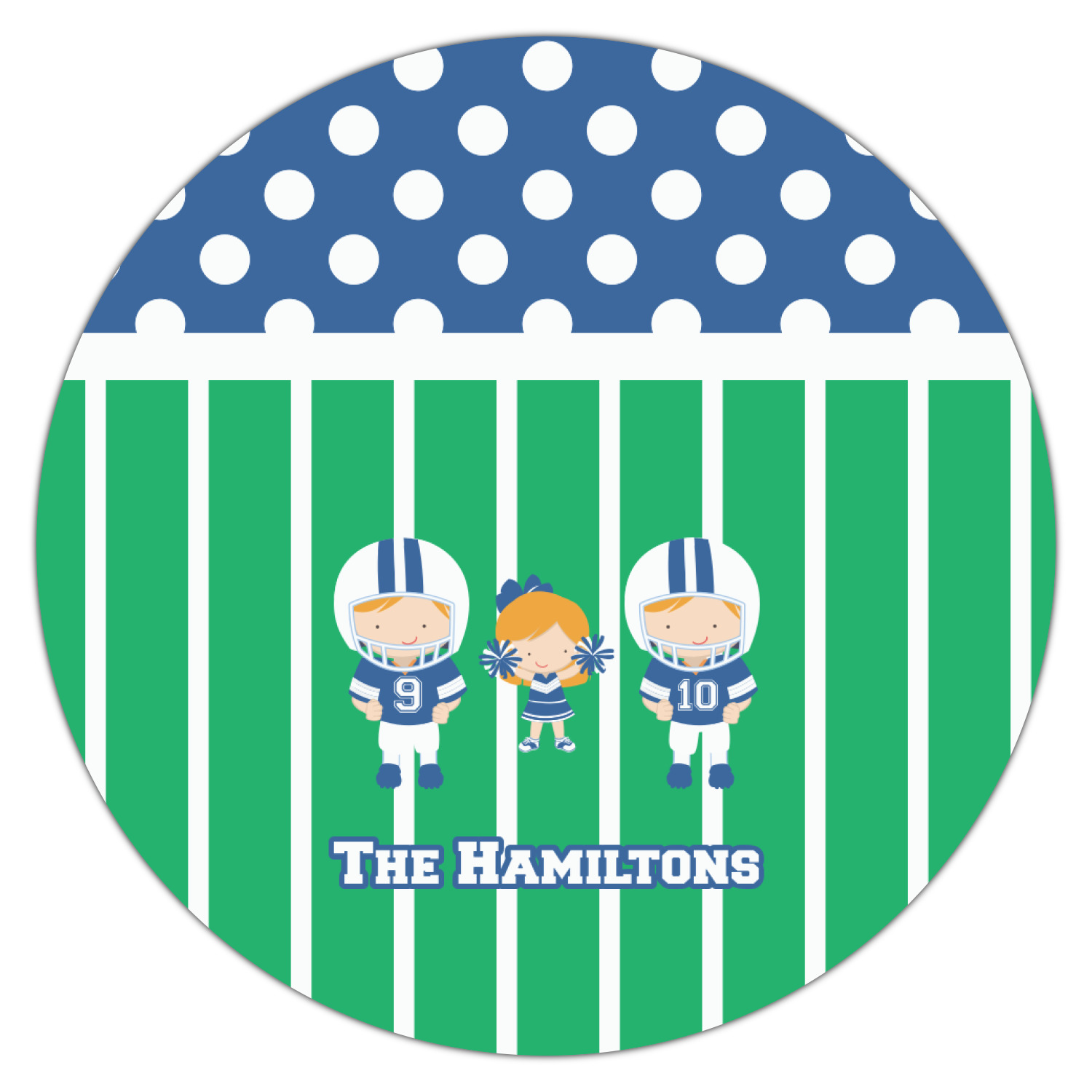 What a great way to showcase your kids and the love of football. A fun polka dot pattern on the top brings fun to the design, while the bottom is the football field. This design is so versatile. Whether you have a football player and a cheerleader, or two football players, or even two cheerleaders and one football player you can mix and match up to three kids.