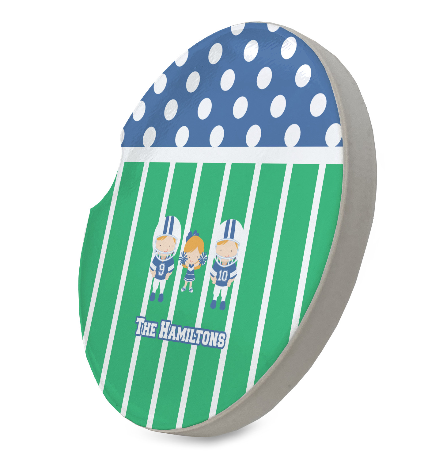 What a great way to showcase your kids and the love of football. A fun polka dot pattern on the top brings fun to the design, while the bottom is the football field. This design is so versatile. Whether you have a football player and a cheerleader, or two football players, or even two cheerleaders and one football player you can mix and match up to three kids.