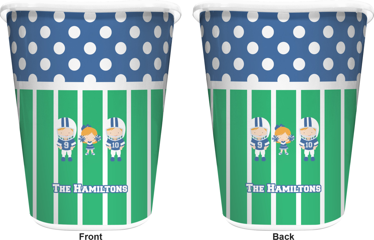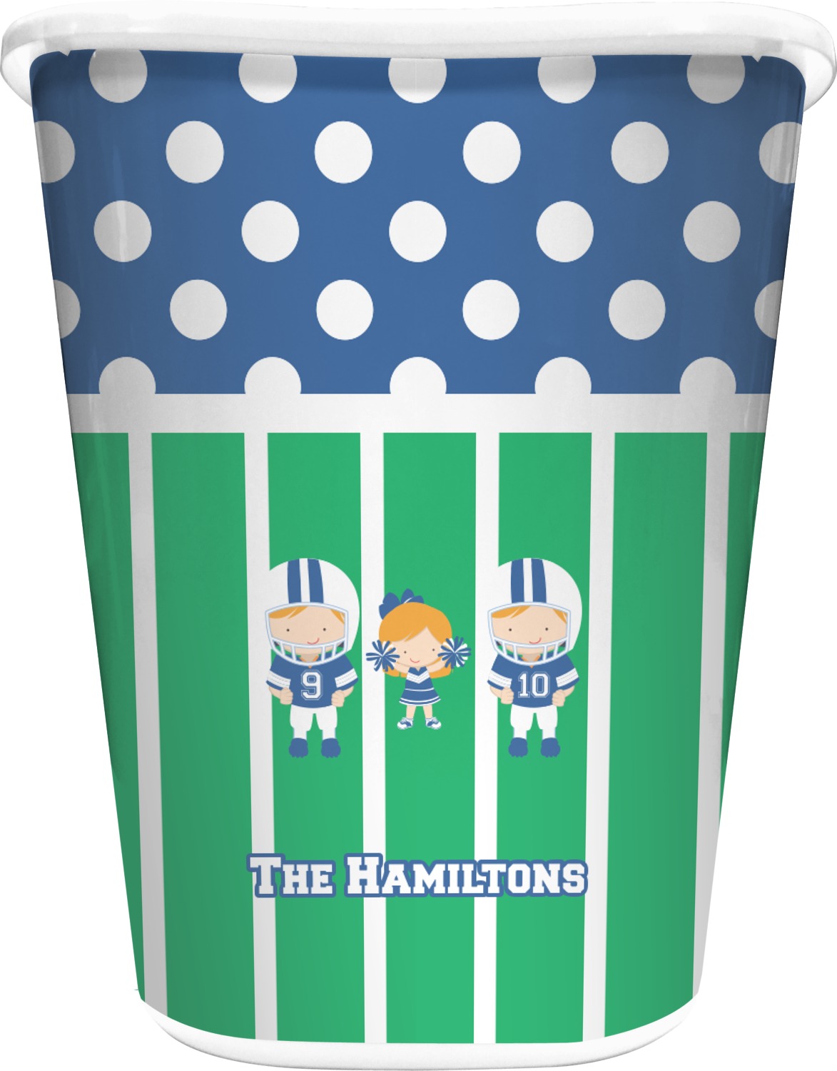 What a great way to showcase your kids and the love of football. A fun polka dot pattern on the top brings fun to the design, while the bottom is the football field. This design is so versatile. Whether you have a football player and a cheerleader, or two football players, or even two cheerleaders and one football player you can mix and match up to three kids.