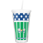 What a great way to showcase your kids and the love of football. A fun polka dot pattern on the top brings fun to the design, while the bottom is the football field. This design is so versatile. Whether you have a football player and a cheerleader, or two football players, or even two cheerleaders and one football player you can mix and match up to three kids.