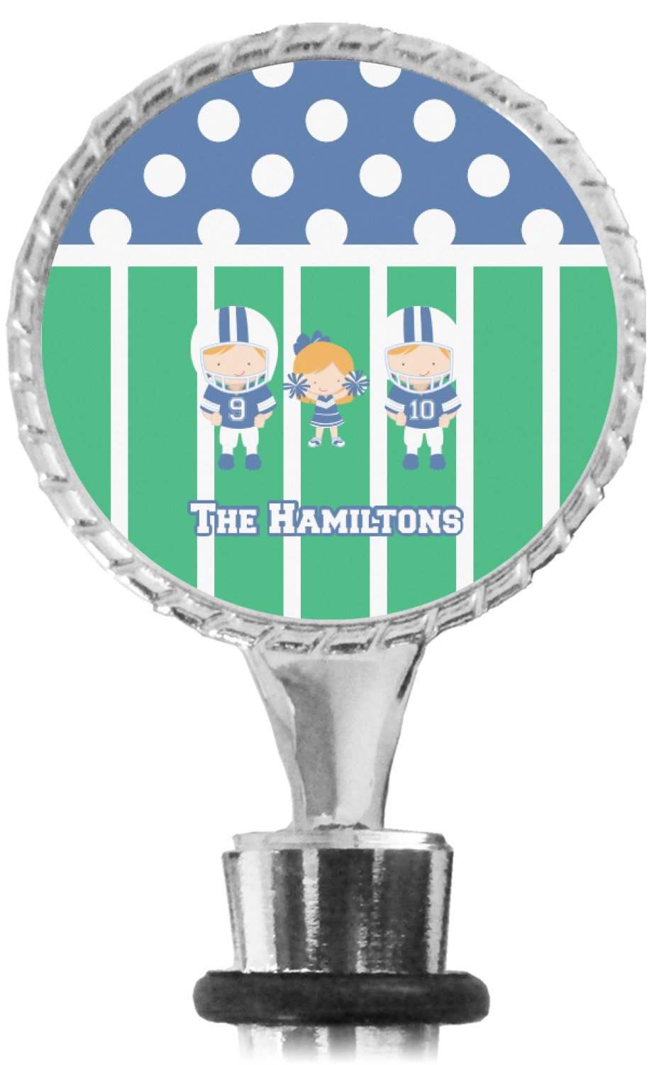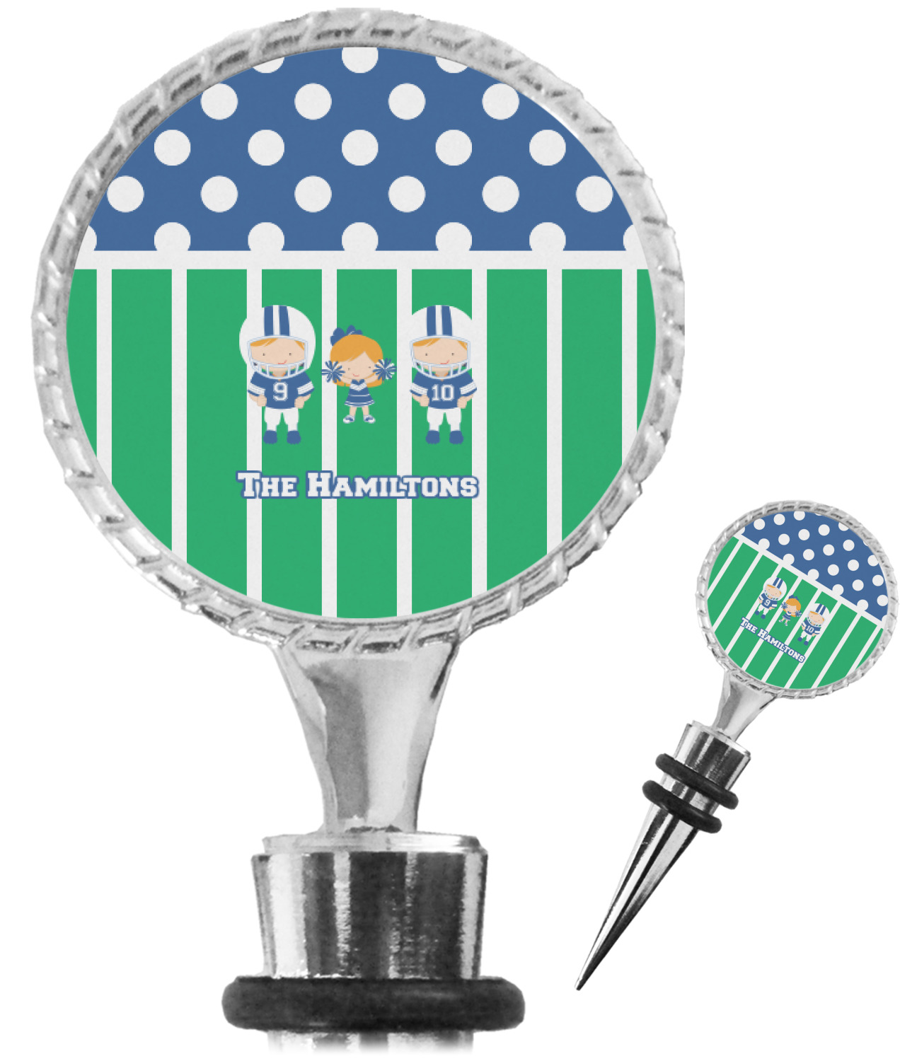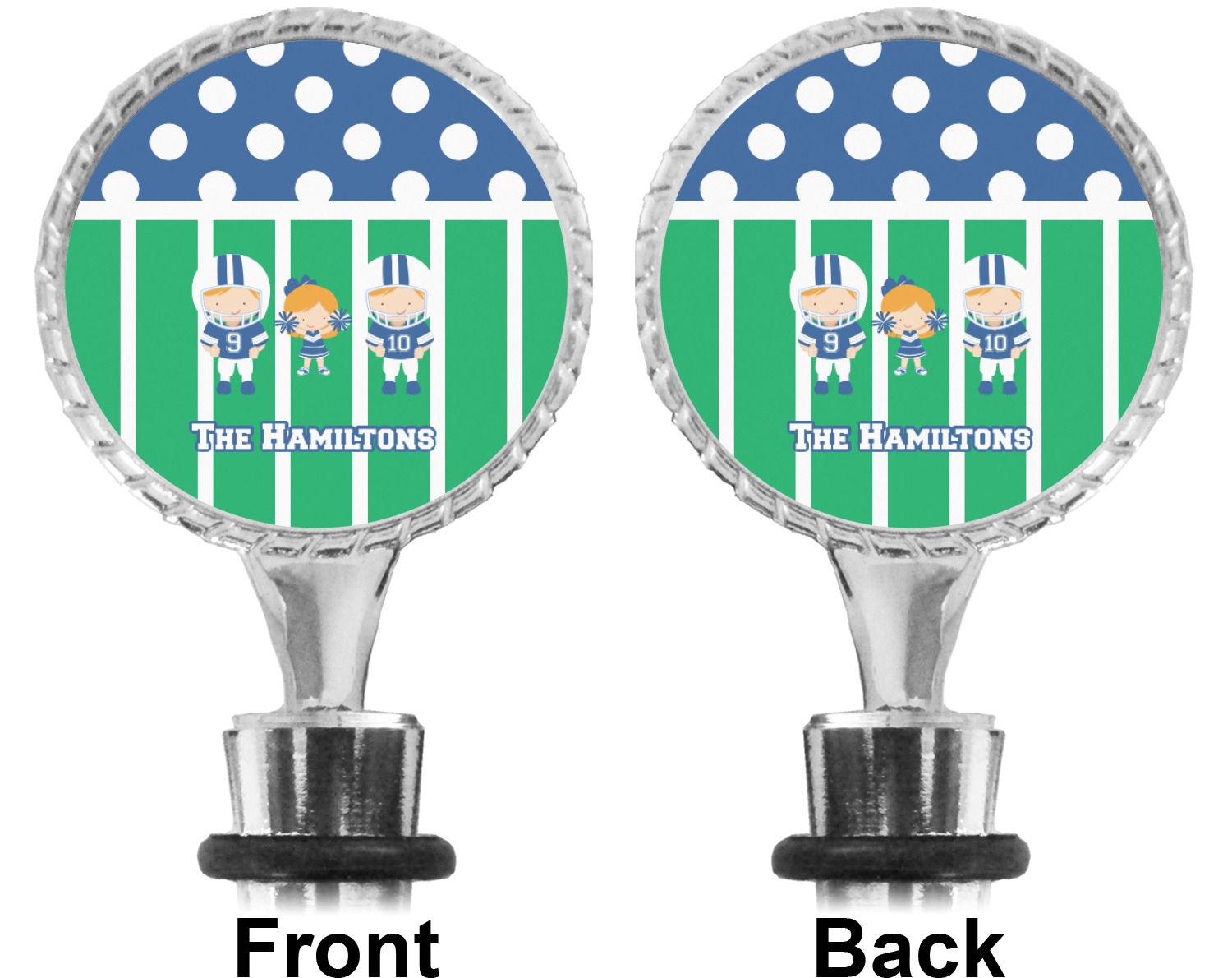 The top part of your bottle stopper is comprised of a zinc ring that displays your customization(s) in its middle, on both sides. The ring is heavy duty, with a bright chrome finish. The body of the wine stoppers have two silicone rings to provide an airtight seal. These wine bottle stoppers measure at 1.625" L x 0.8125" W x 4.625" H; your custom wine stopper is meant to fit into most standard-sized wine bottles.