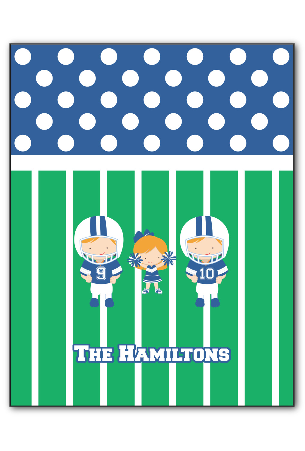 What a great way to showcase your kids and the love of football. A fun polka dot pattern on the top brings fun to the design, while the bottom is the football field. This design is so versatile. Whether you have a football player and a cheerleader, or two football players, or even two cheerleaders and one football player you can mix and match up to three kids.