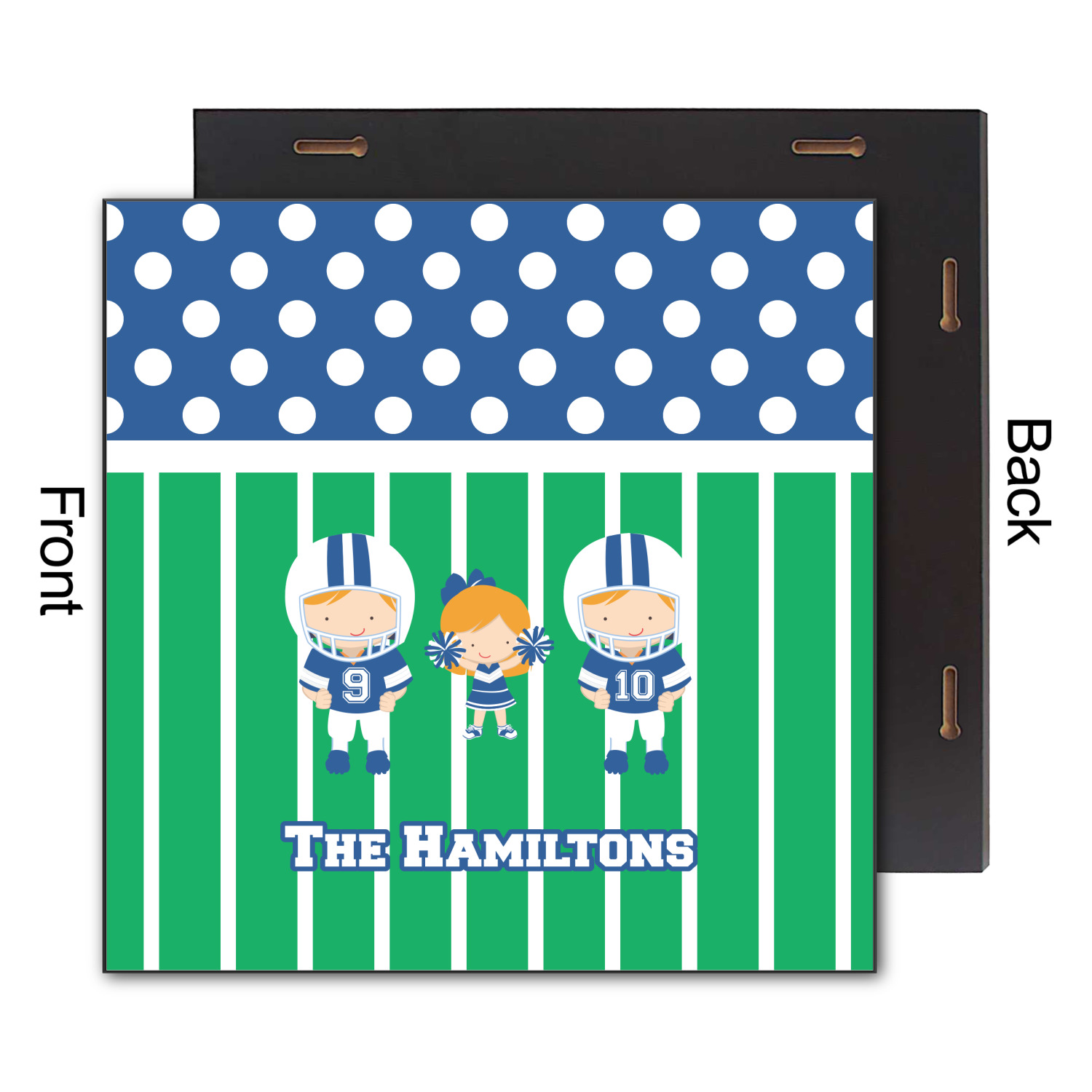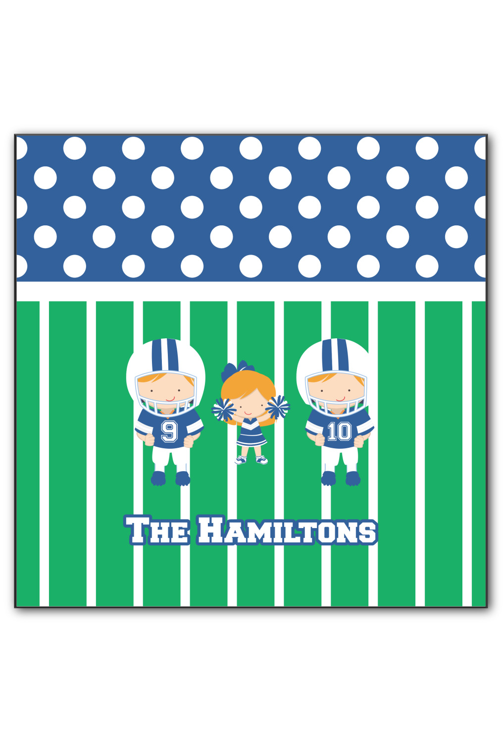 What a great way to showcase your kids and the love of football. A fun polka dot pattern on the top brings fun to the design, while the bottom is the football field. This design is so versatile. Whether you have a football player and a cheerleader, or two football players, or even two cheerleaders and one football player you can mix and match up to three kids.
