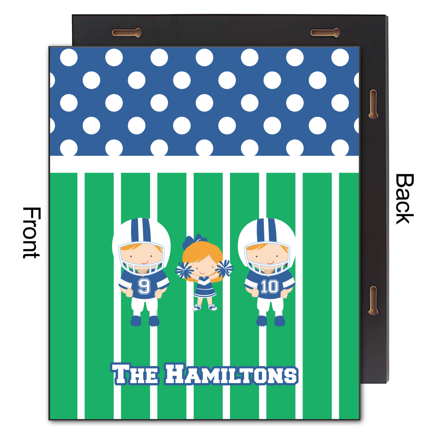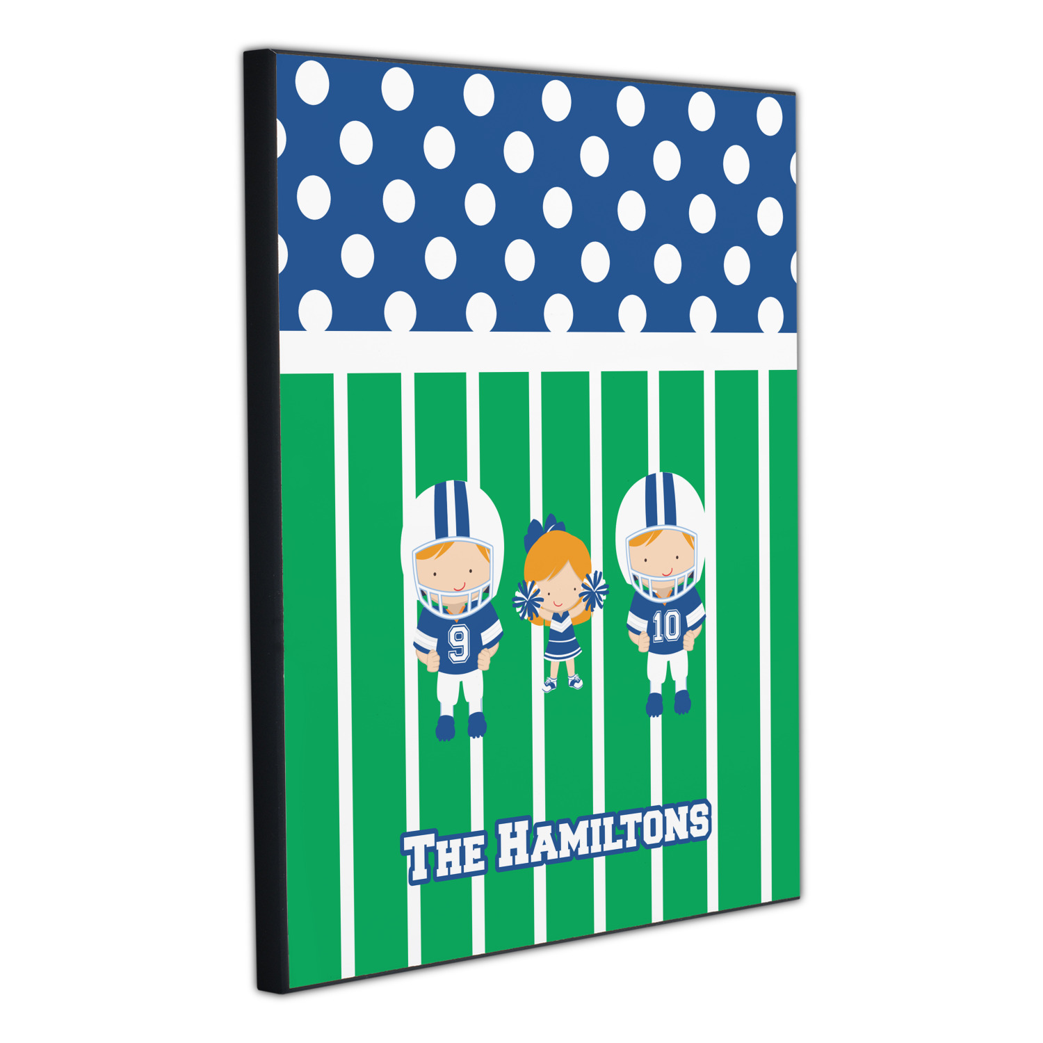 What a great way to showcase your kids and the love of football. A fun polka dot pattern on the top brings fun to the design, while the bottom is the football field. This design is so versatile. Whether you have a football player and a cheerleader, or two football players, or even two cheerleaders and one football player you can mix and match up to three kids.