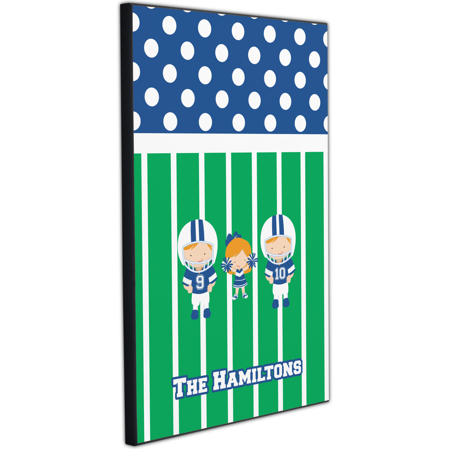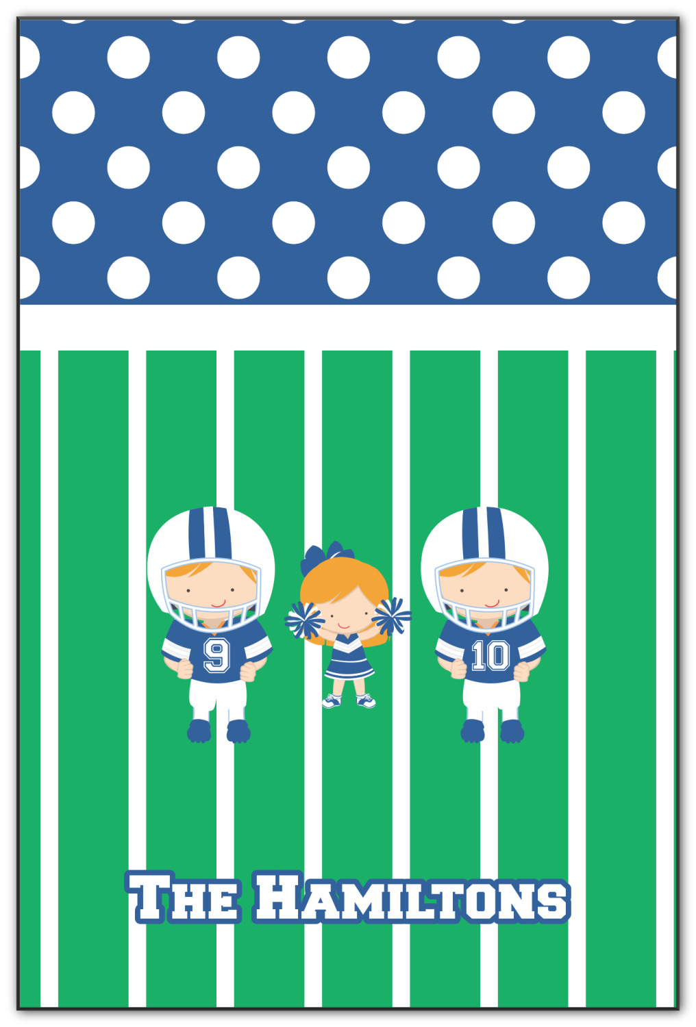 What a great way to showcase your kids and the love of football. A fun polka dot pattern on the top brings fun to the design, while the bottom is the football field. This design is so versatile. Whether you have a football player and a cheerleader, or two football players, or even two cheerleaders and one football player you can mix and match up to three kids.