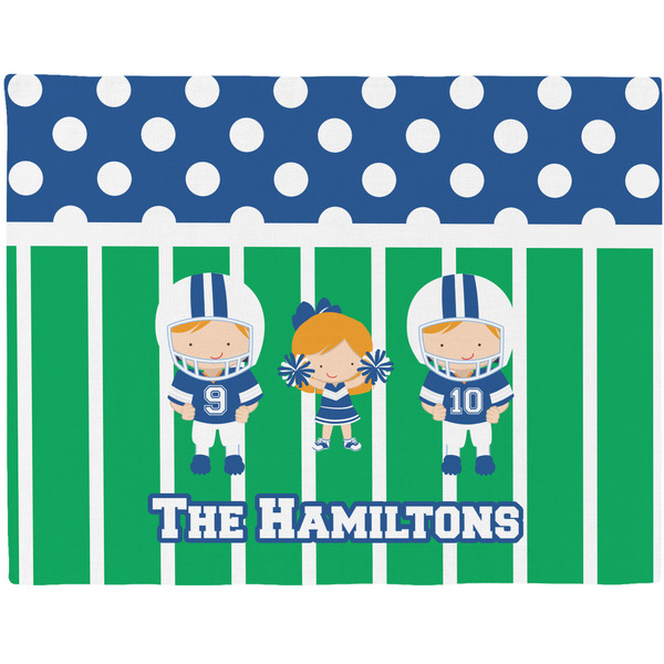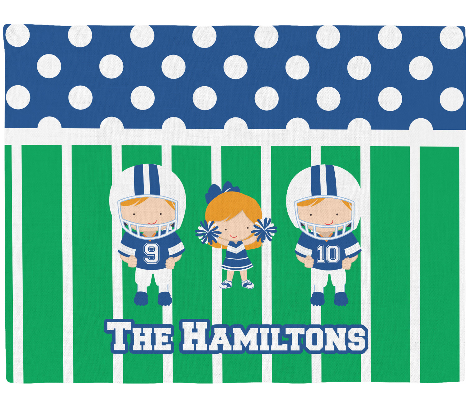 What a great way to showcase your kids and the love of football. A fun polka dot pattern on the top brings fun to the design, while the bottom is the football field. This design is so versatile. Whether you have a football player and a cheerleader, or two football players, or even two cheerleaders and one football player you can mix and match up to three kids.